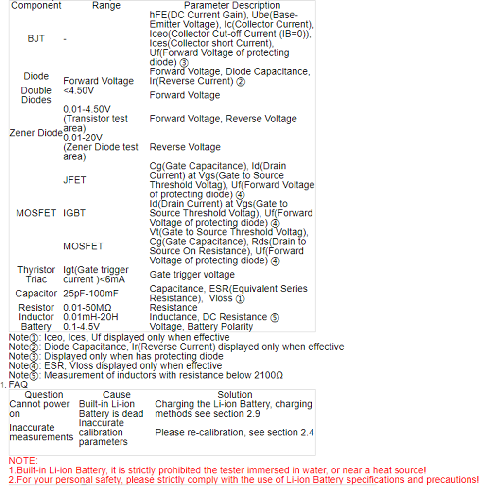 Предупреждение: встроенный литий-ионный аккумулятор, строго запрещен тестер, погруженный в воду, или рядом с источником тепла!