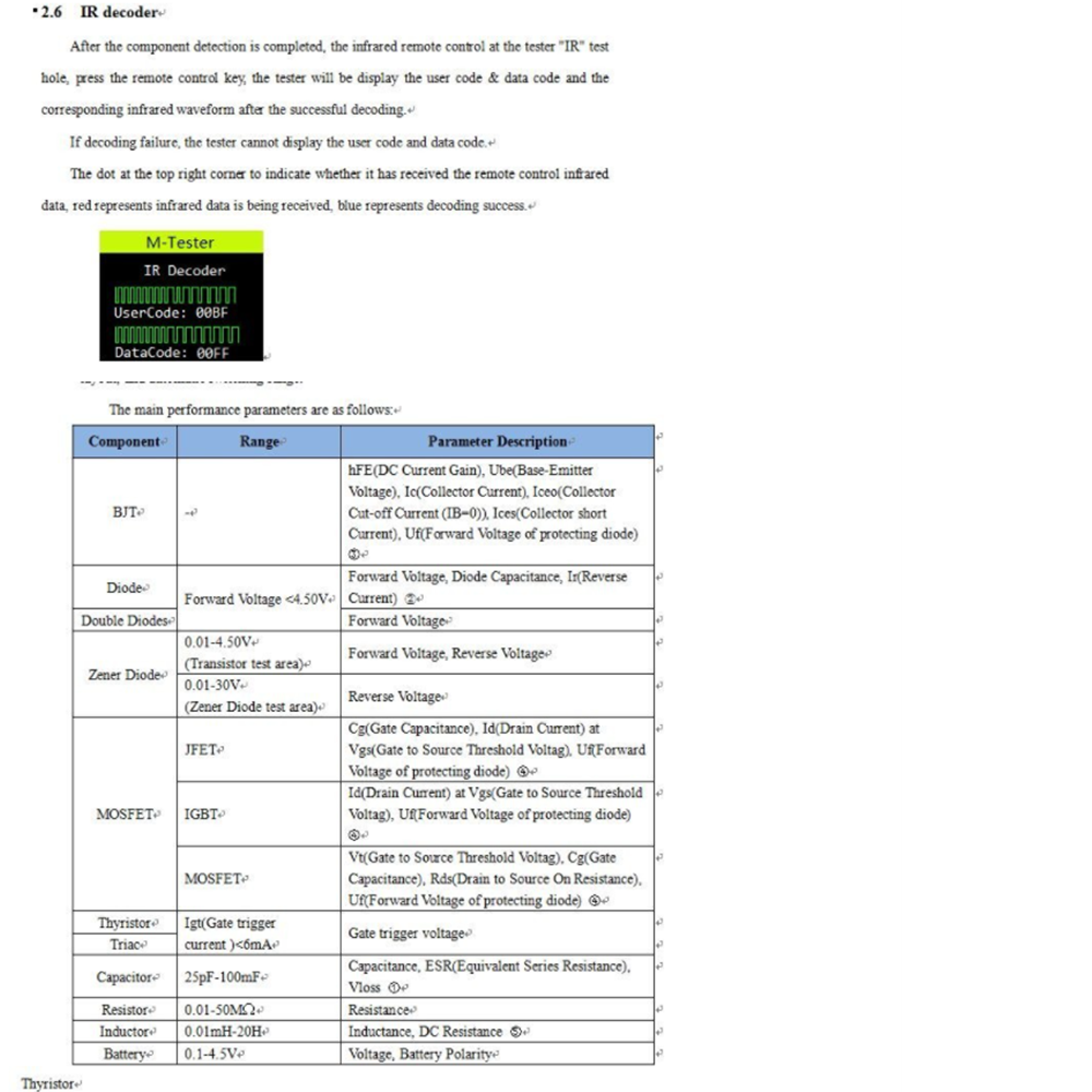 Автоматическое обнаружение биполярных транзисторов NPN и PNP, N-channel и P-канальные МОП-транзисторы, JFETs, диодов (включая двойные диоды), N-и P-IGBTs, резисторов (включая потенциометры), индукторов, конденсаторы, Тиристоры, Триаки и батареи (0,1-4,5 в)