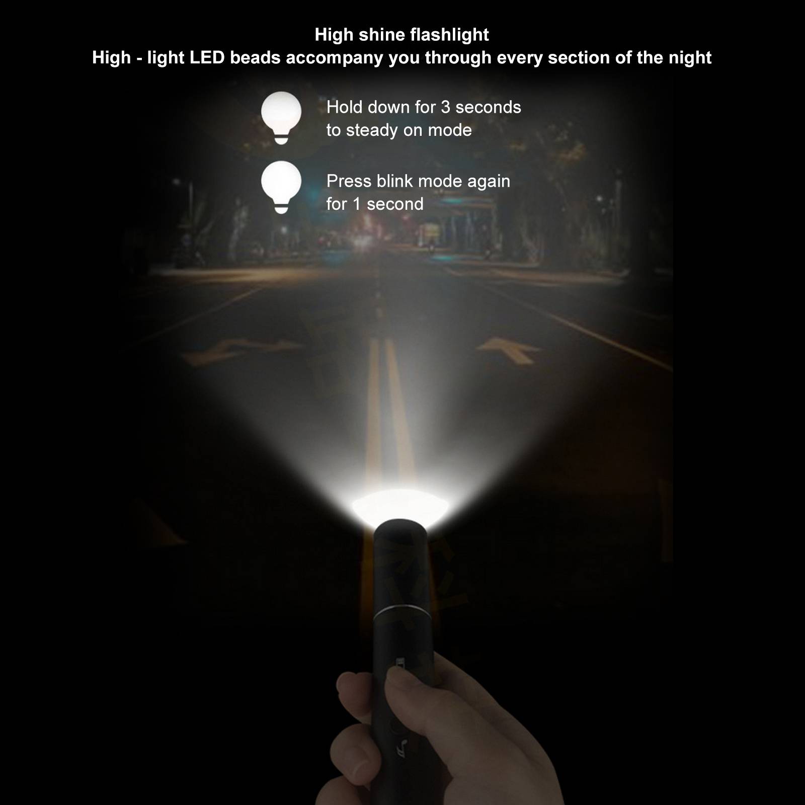 Есть два светильник режимы: высокий светильник и режим мигания. Вы можете выбрать понравившийся вам режим, нажав на переключатель.