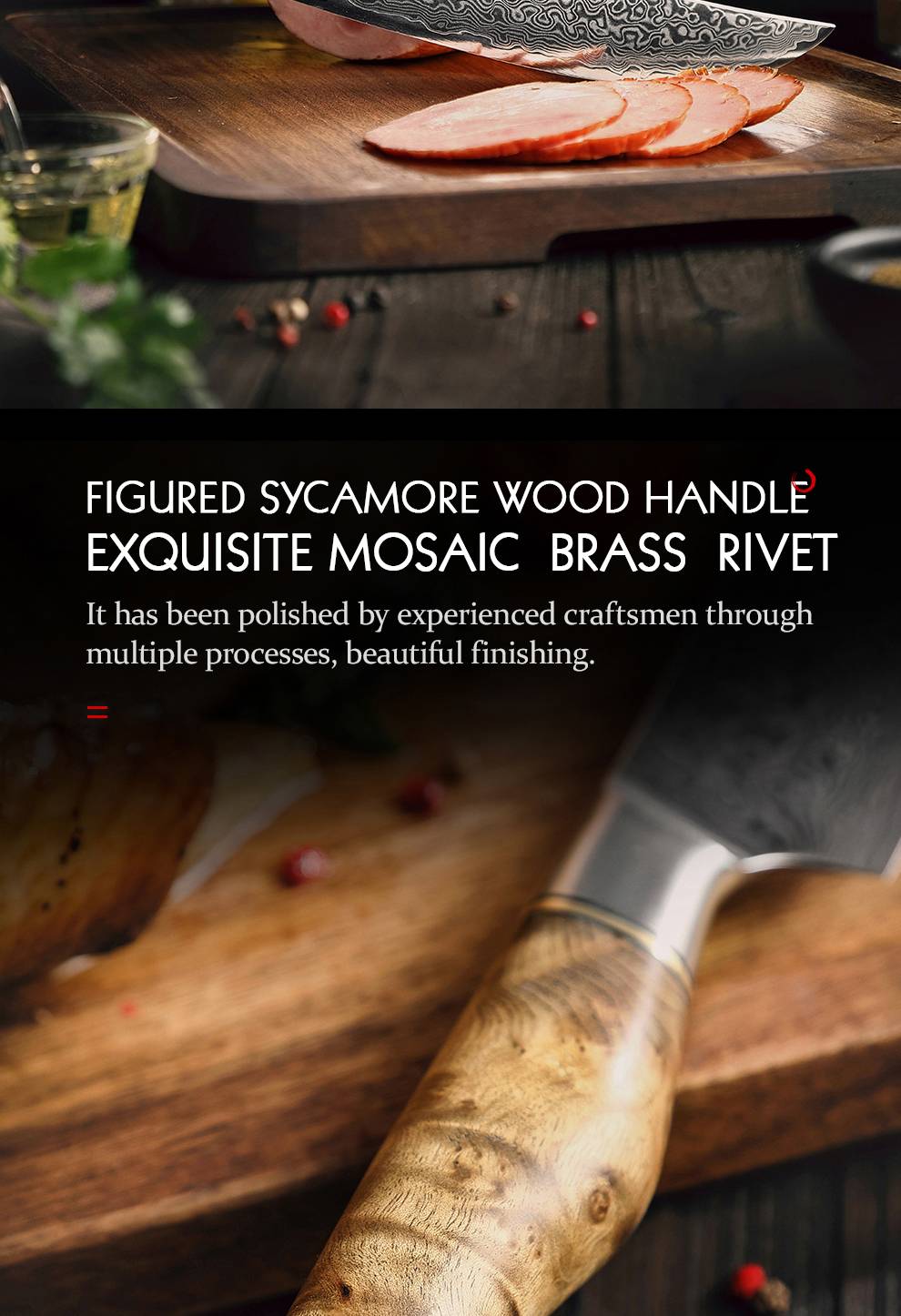 Материал ручки:Высококачественные фигурные деревянные ручки sycamore и мозаичные латунные заклепки
