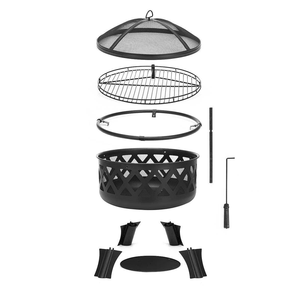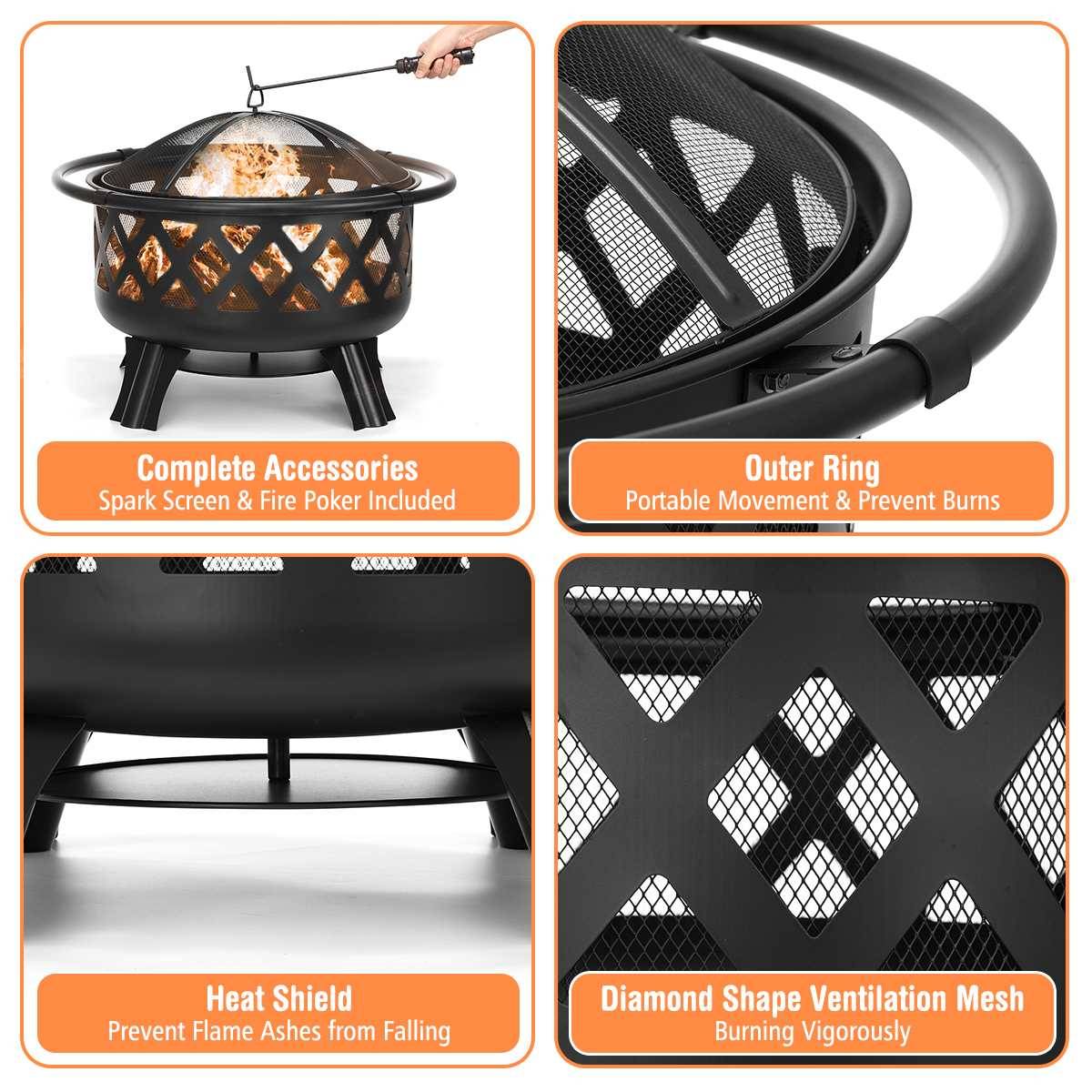 Построено до конца-Долговечные сверхмощные Калибровочные стальные и сетчатые котел обработаны высокотемпературной краской для длительного использования. С защитой от атмосферных воздействий, большой несущей способностью, долговечностью и устойчивостью к коррозии, это сжигание древесной ямы имеет низкие затраты на техническое обслуживание. 4 ножки симметрично распределены для поддержания лучшей стабильности, так что пожарная яма заднего двора не легко встряхивать во время использования