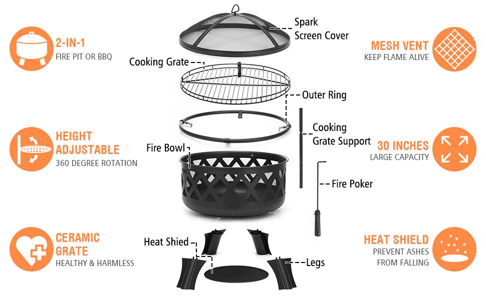 Безопасный и надежный-Эта огненная яма для патио поставляется с искровым экраном и огненным покером, чтобы защитить вас и близких от опасных летающих углей. Бесшовная кольцевая ручка делает движение костра портативным, а также предотвращает ожогов членов семьи. В нижней части огнеупорной чаши имеется съемный и легко Очищаемый тепловой щит, зола не попадет непосредственно на землю или газон; Предотвращает падение искры, избегайте огня и Защищайте окружающую среду