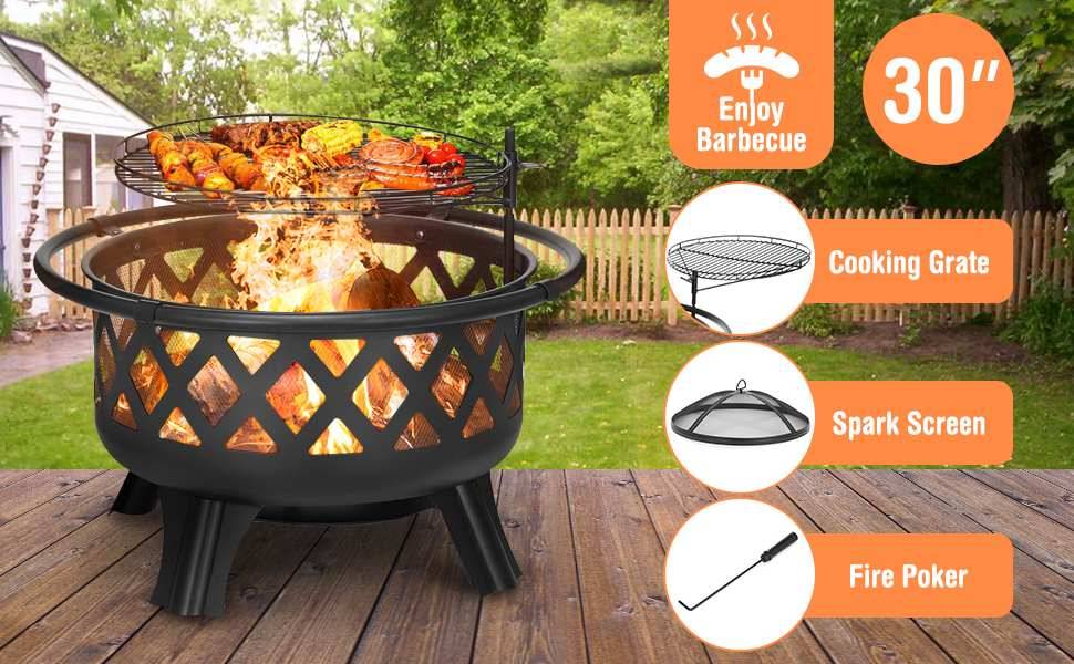 2-в-1 костра под открытым небом-Многофункциональная пожарная яма 30 "от KINGSO является отличным выбором для наружного отопления и гриля. Изготовлен для двойного назначения, уникальный дизайн включает в себя решетку для приготовления пищи для удобного гриля и сетчатый экран для безопасности. Сетчатые отверстия в форме бриллианта обеспечивают лучшую циркуляцию воздуха для длительного горения. Пожарная чаша большой емкости может держать достаточно дров