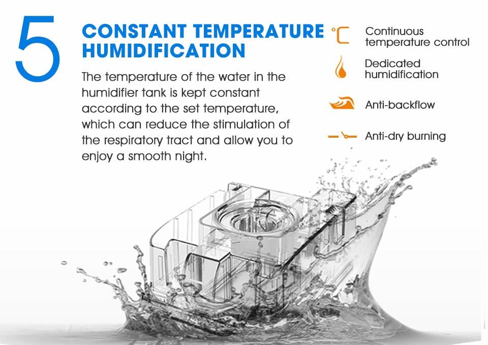 Температура воды в резервуаре для увлажнителя остается неизменной в соответствии с установленной температурой, что может уменьшить стимуляцию дыхательных путей и позволить вам наслаждаться гладкой ночью