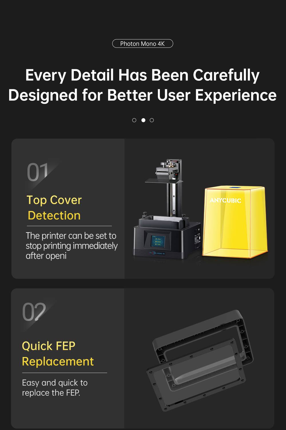 Моно 4K поддерживает 30%-100% УФ-настройки питания и может быть адаптирован к печати смолы с различными УФ-энергетическими требованиями для удовлетворения Ваших индивидуальных потребностей печати.