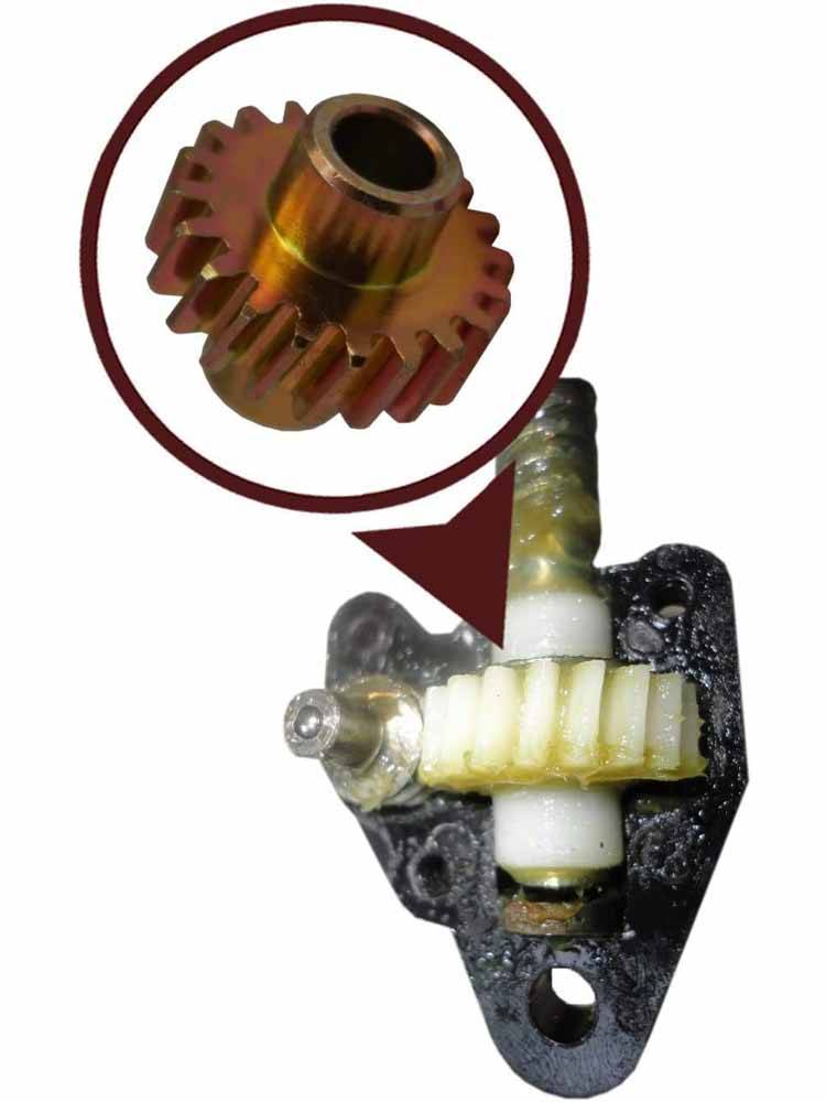 Шестерня изготовлена из латуни. Латунная шестерня работает в обоих типах мотора (короткий и длинный шпиндель). Посылка состоит из зубчатой передачи, смазки, втулки адаптера и сверла.