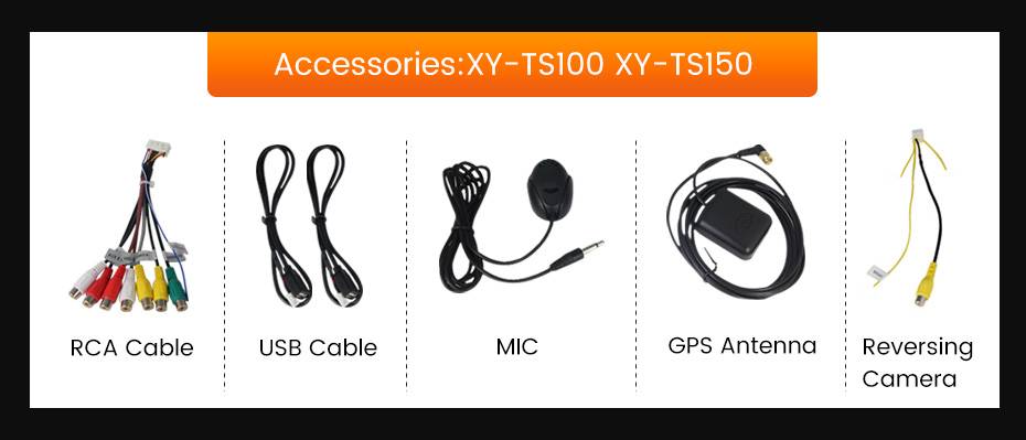 Один кабель RCA с внешним входом микрофона, два usb-кабеля, один подарок микрофона, один антенный кабель GPS, один кабель камеры заднего хода с WiFi и сигнальными кабелями BT (аксессуары TS100 ,TS150)
