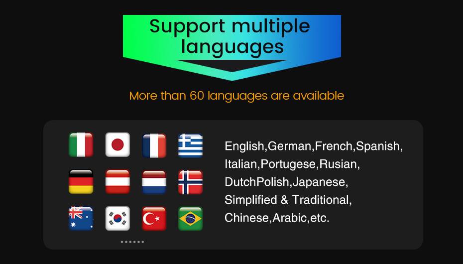 Русский, английский, испанский, итальянский, французский, чешский, арабский, немецкий, иврит, китайский, эстонский, польский, филиппинский, финский, корейский, голландский, хорватский, латышский,