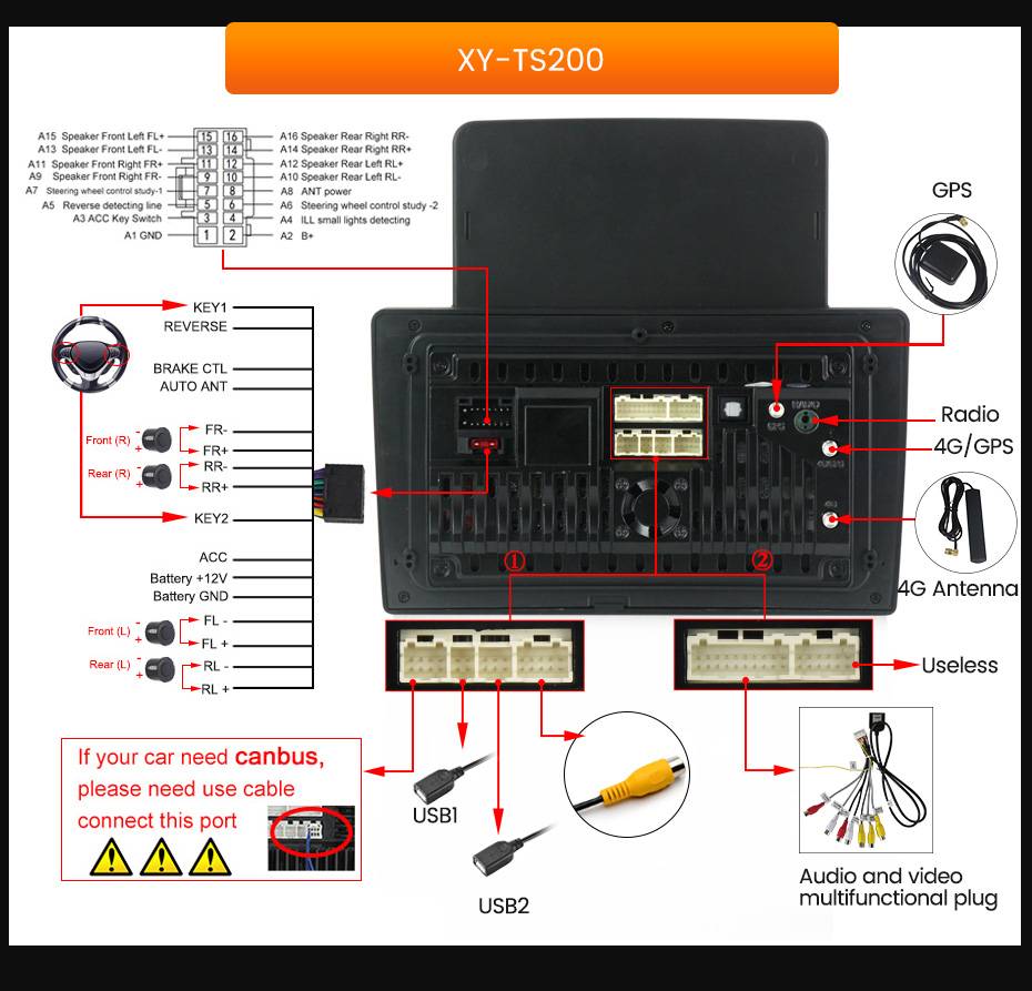 Один кабель RCA с внешним входом микрофона с одним слотом для sim-карты 4G, два usb-кабеля, один антенный кабель 4G, один подарок микрофона, один антенный кабель GPS, один Реверсивный кабель камеры с WiFi и BT сигнальными кабелями (аксессуары TS200)