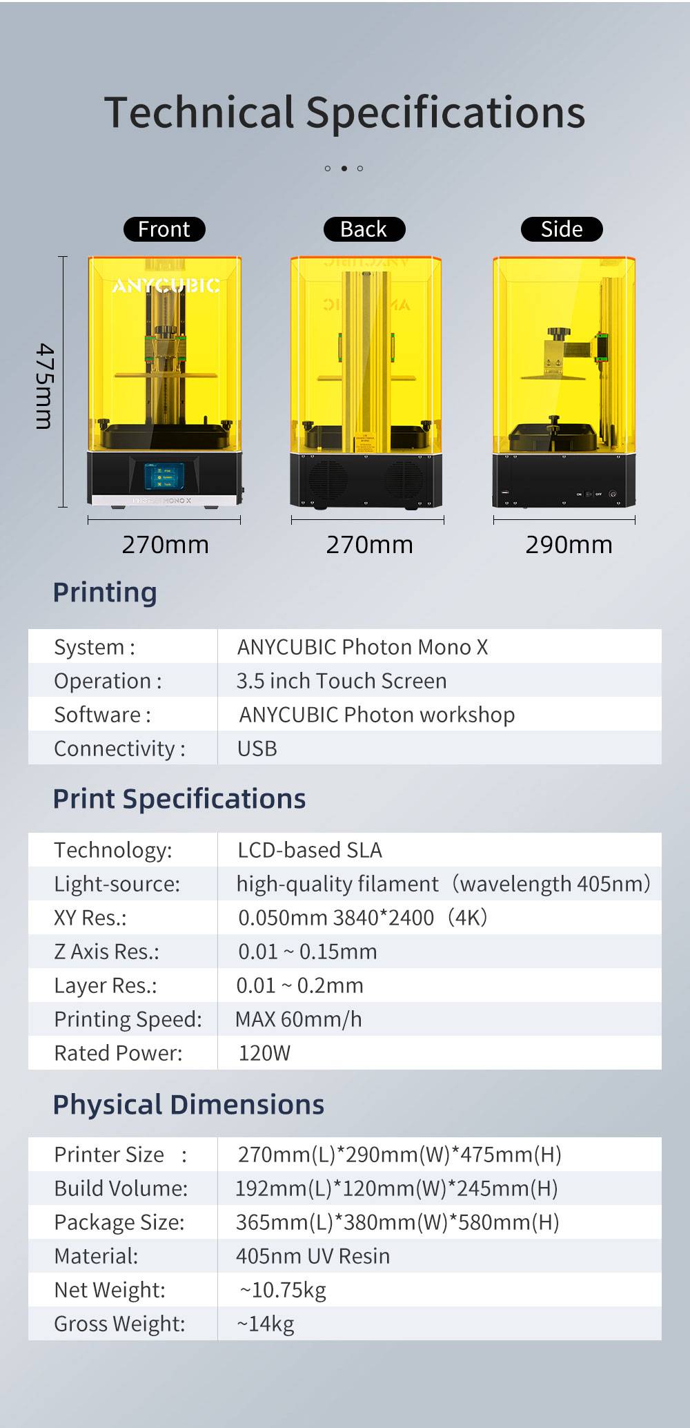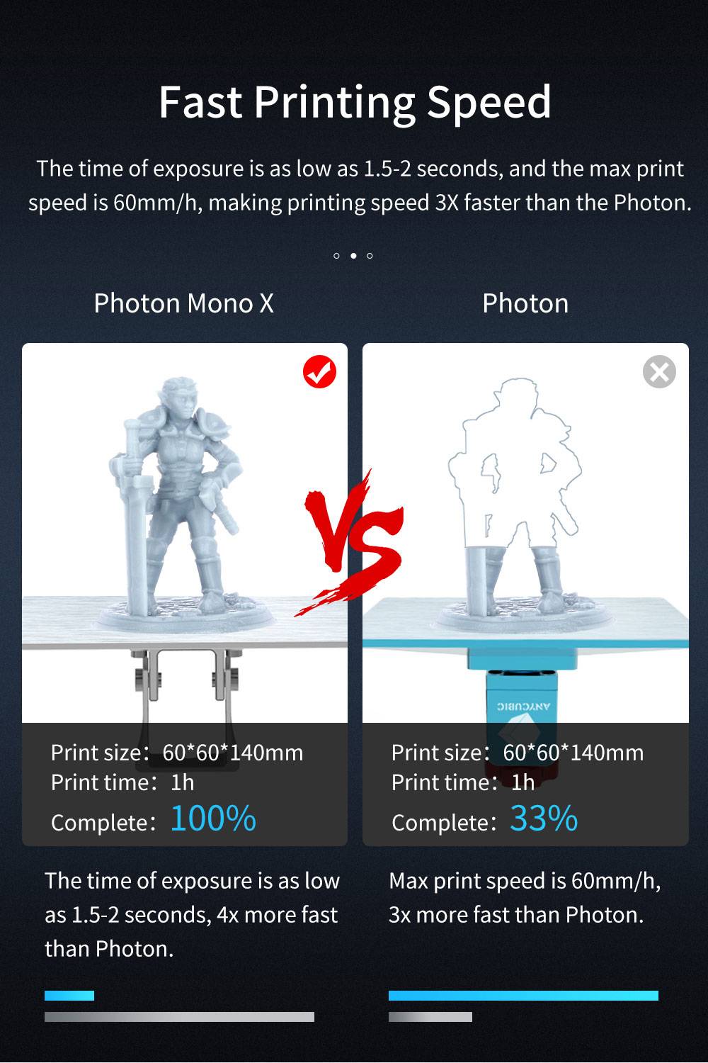 Время выдержки составляет всего 1,5-2 секунды, а максимальная скорость печати 60 мм/час, делая скорость печати 3X быстрее, чем Фотон.