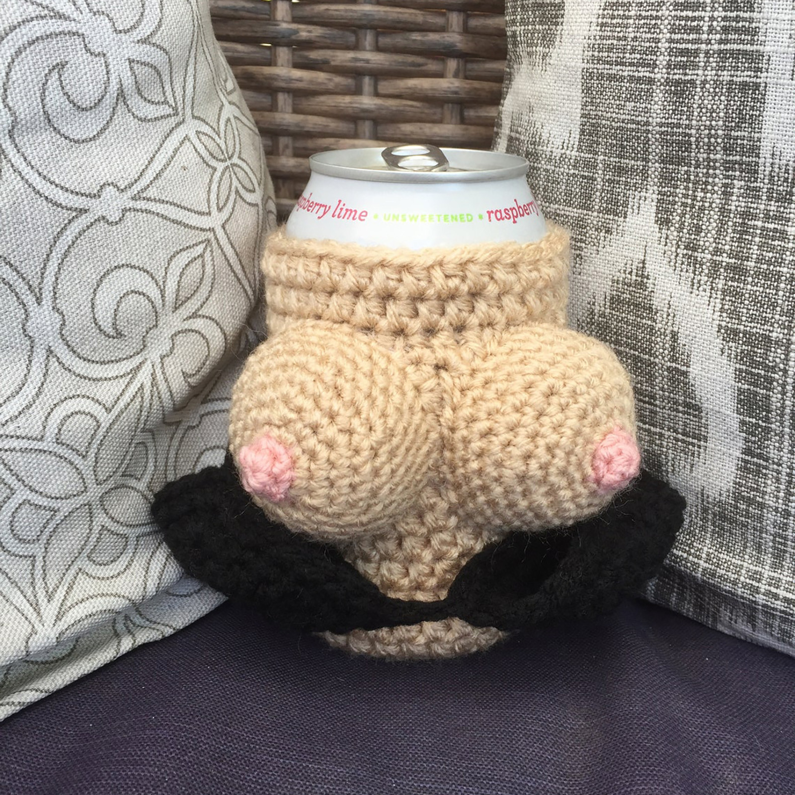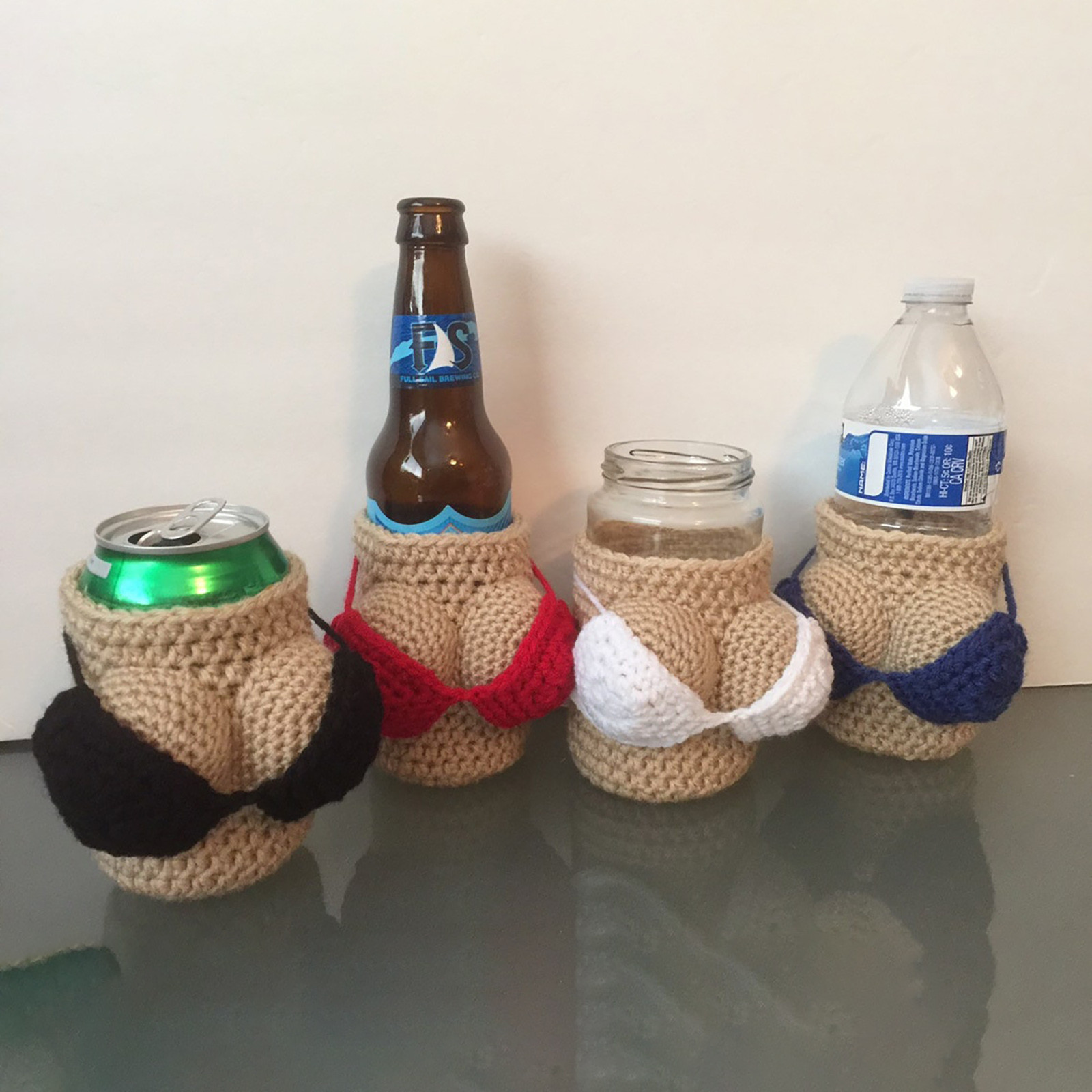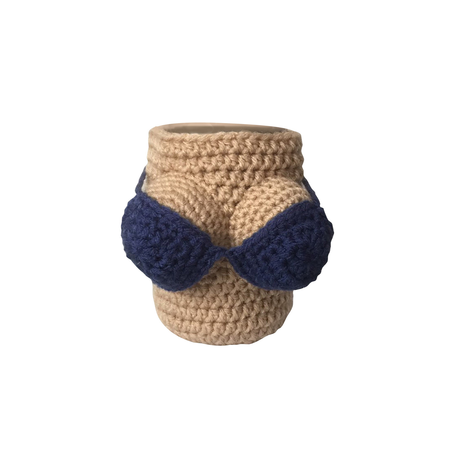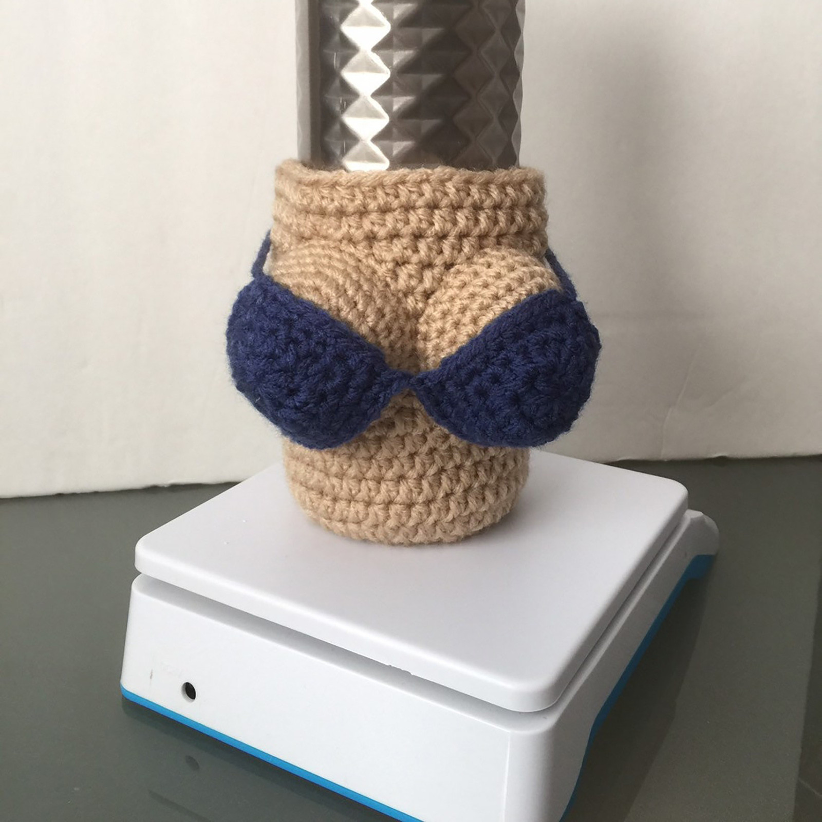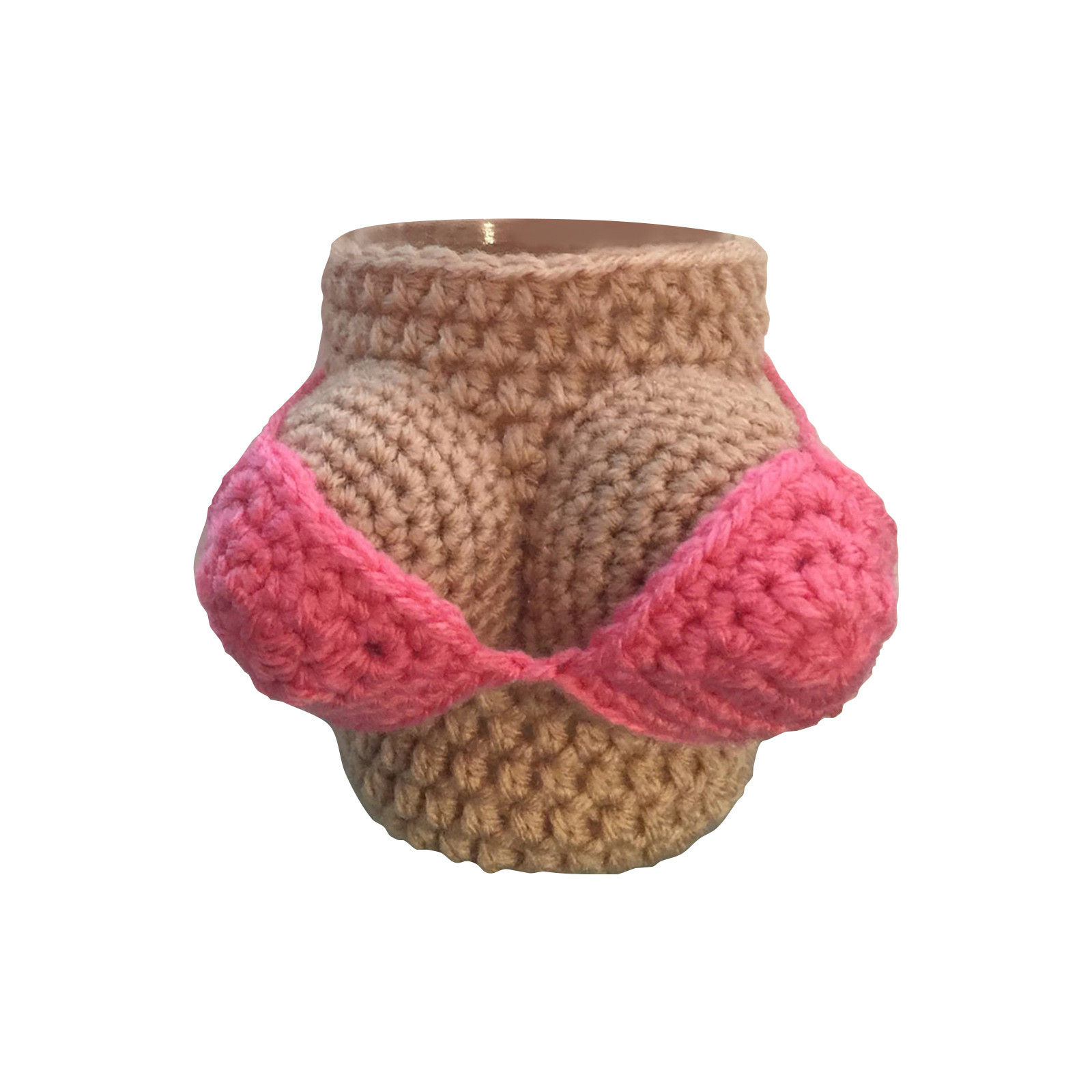 This is a handmade crocheted Cozy, which looks like the chest of a bikini top