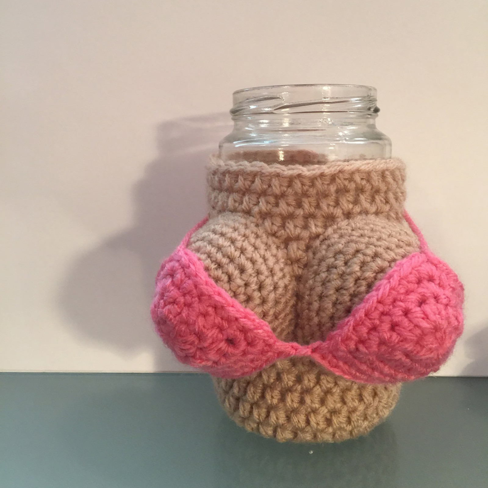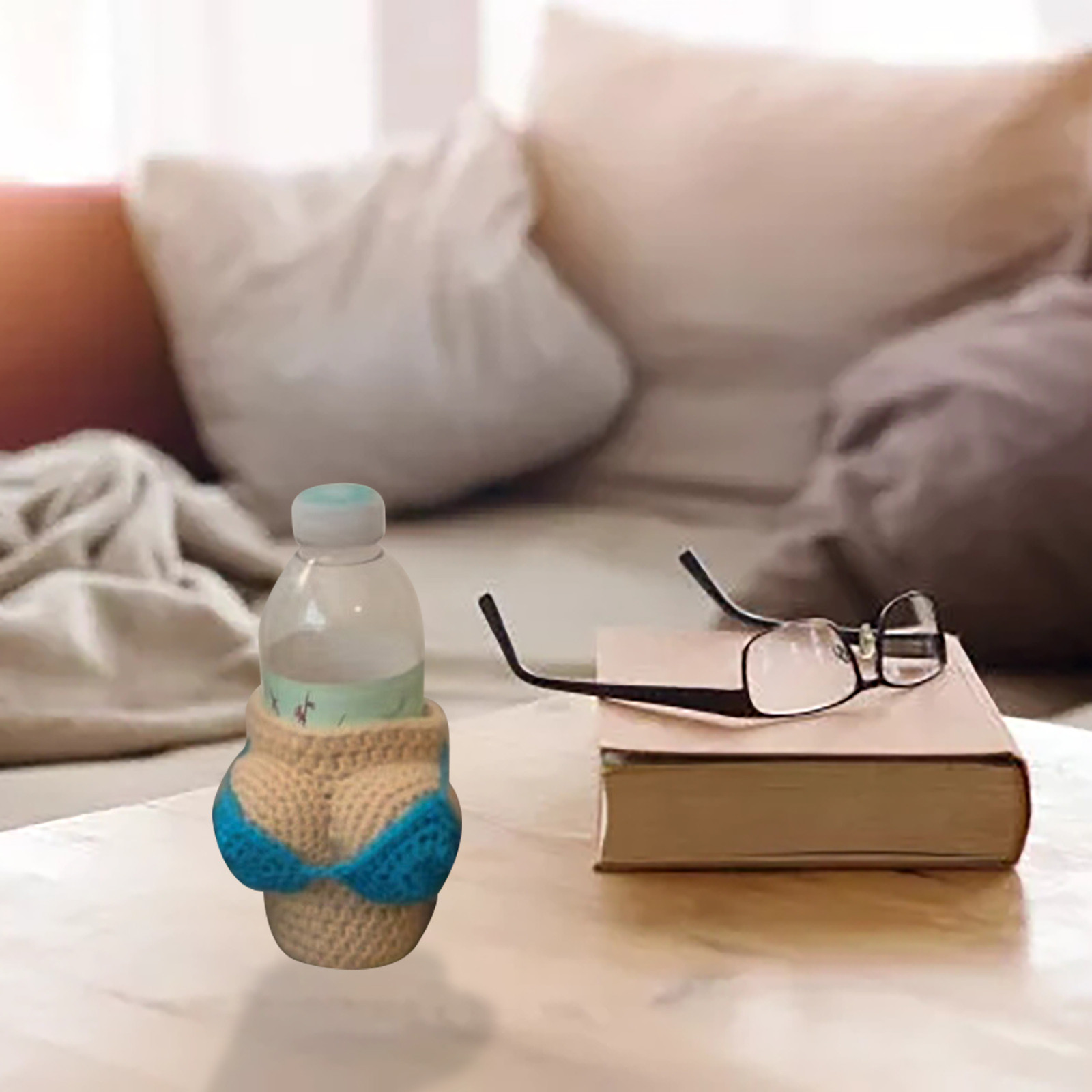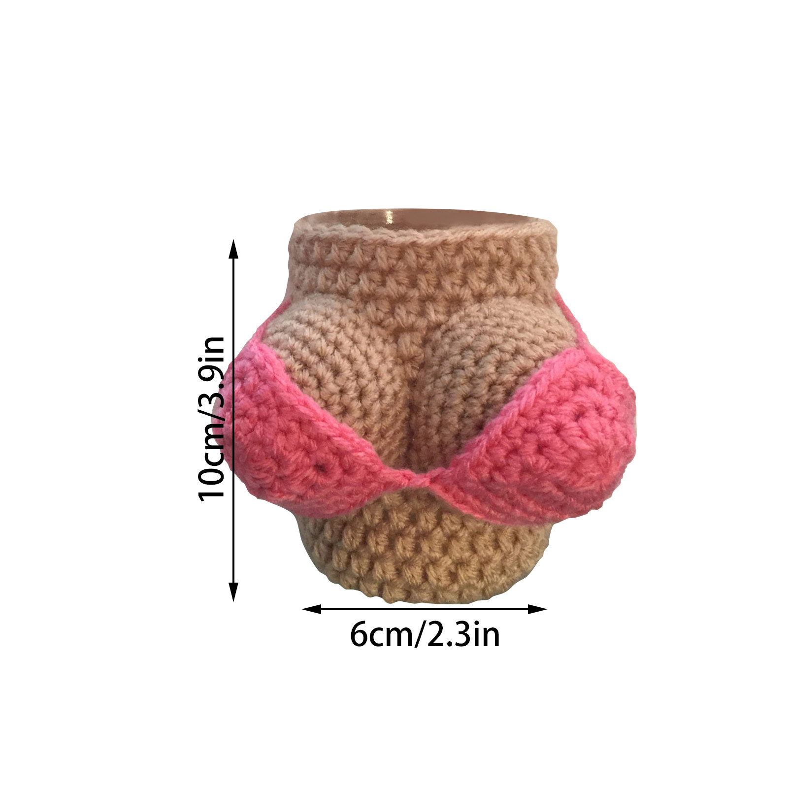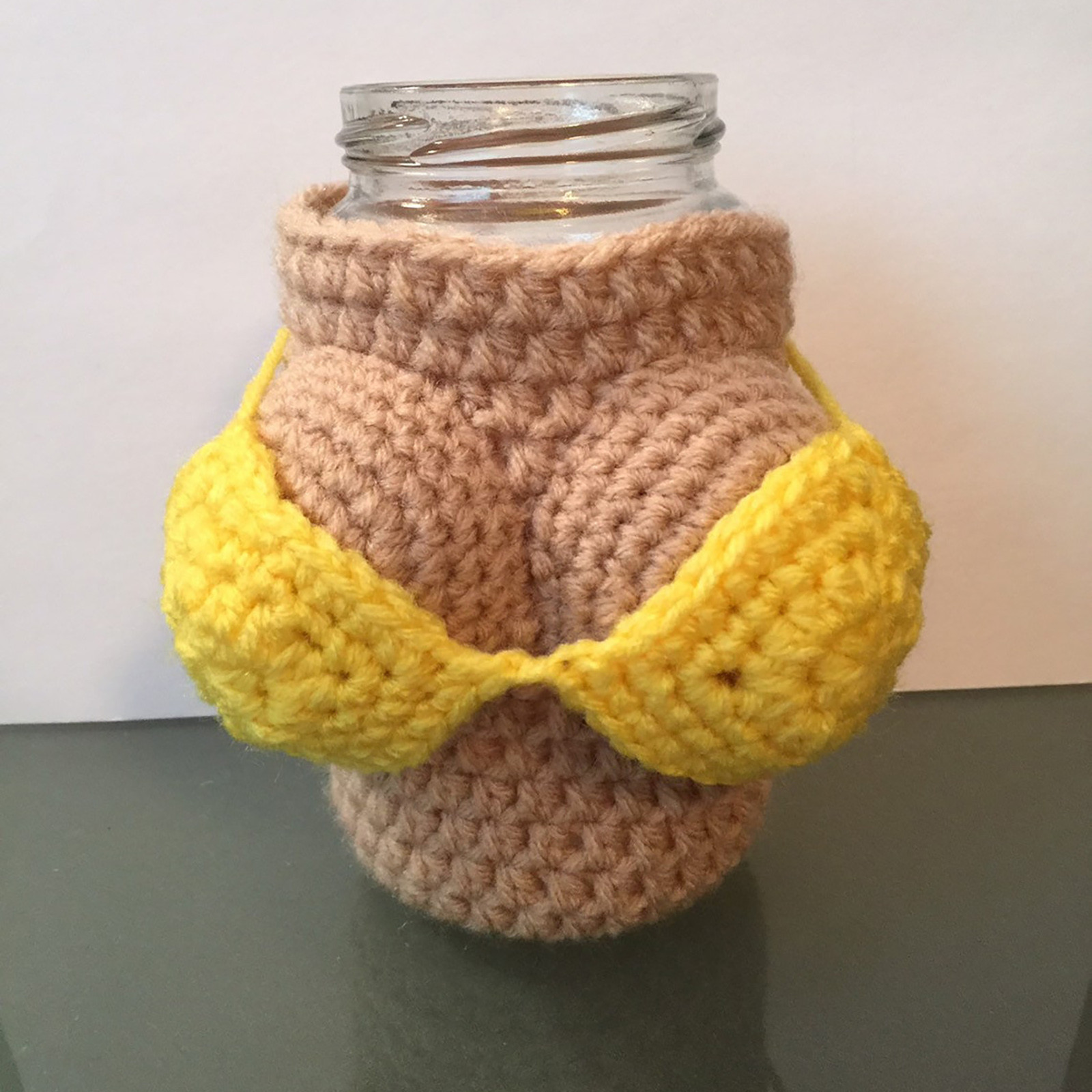 This is a handmade crocheted Cozy, which looks like the chest of a bikini top