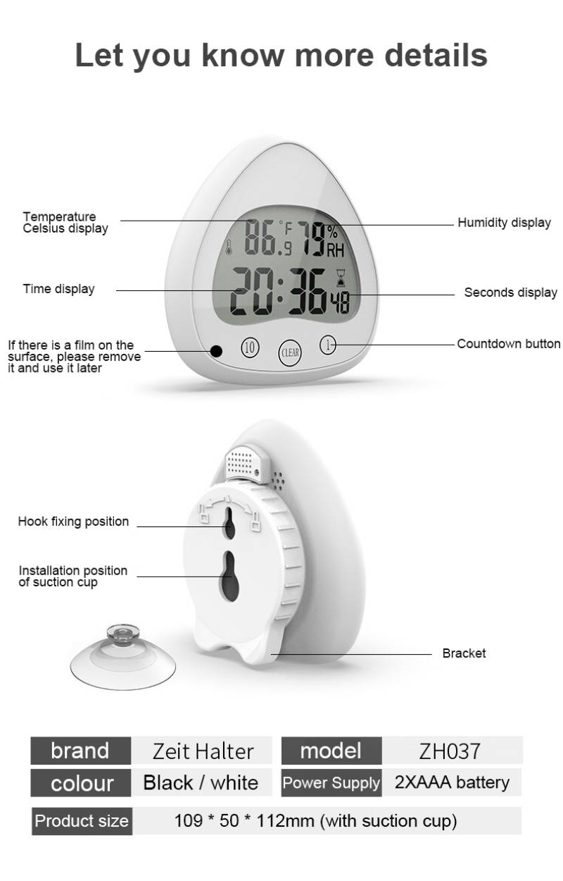Посылка содержит: ZH037 часы для ванной * 1, руководство на английском языке * 1, цветная коробка * 1, пузырчатая сумка * 1.