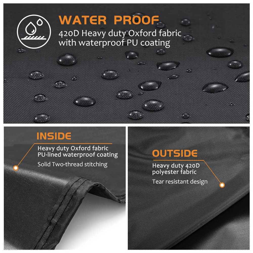 【Windproof】Крышка для гриля не будет выдуваться ветром. Мы добавили что-то липкое с обеих сторон и регулируемую термоусадочную веревку на нижней части крышки для барбекю, даже используется в плохую погоду, сохраняя гриль сухим и безопасным.