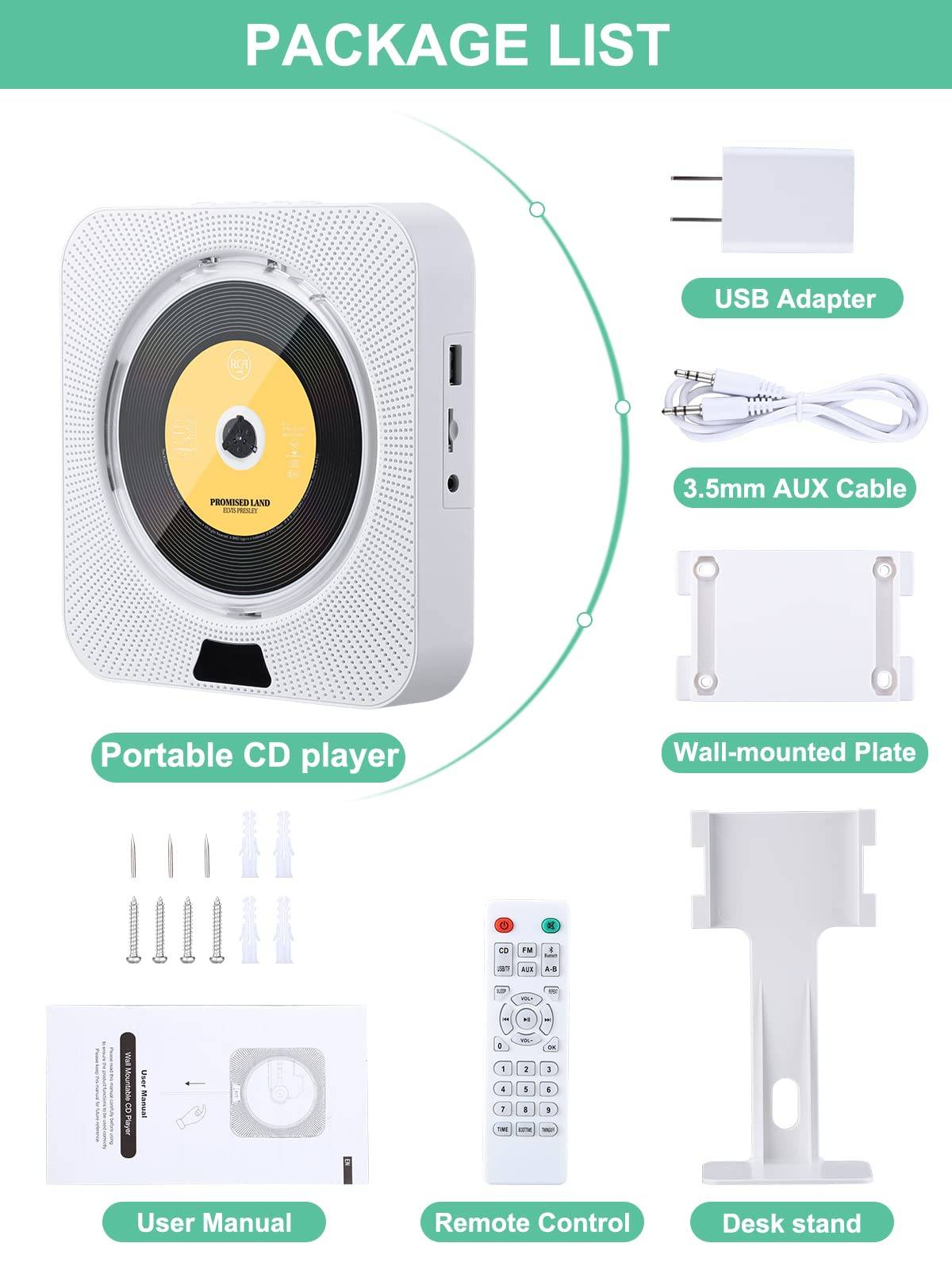 【Классический дизайн кабеляКреативный дизайн переключателя позволяет легко открывать и управлять. Поставляется с настенным набором и подставкой, легко крепится на стену, красиво и компактно. Кроме того, есть настольная подставка, вы можете разместить CD музыкальный плеер в гостиной, столовой, спальне или где угодно. С пультом дистанционного управления вы можете управлять cd-плеером только на ладони!