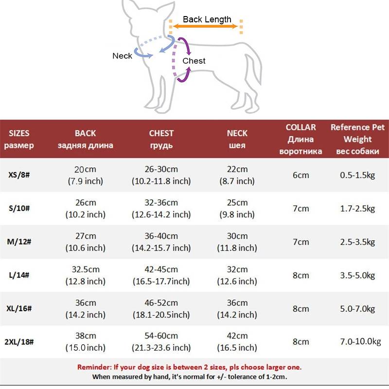 При заказе Измерьте длину спины и обхват груди вашей собаки, а затем выберите подходящий размер в соответствии с размером таблицы.