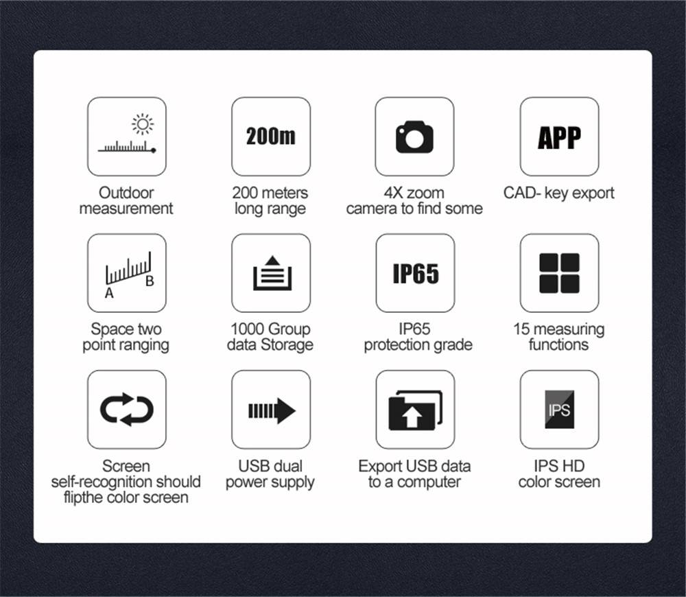 Что находится в pacakge 1 * Лазерный дистанс-метр 1 * Руководство пользователя 2 аккумулятора * aaa