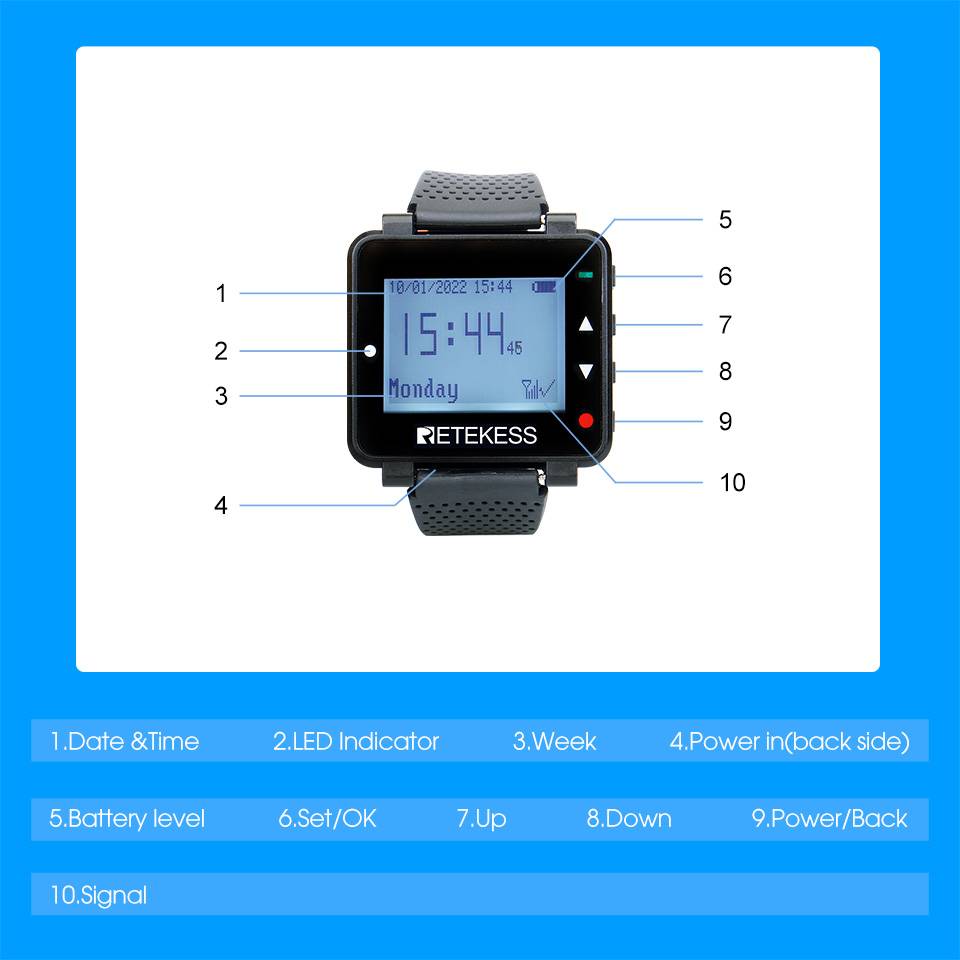 4.Совместим с несколькими пейджерами Retekess, этот приемник часов может соединить до 500 пейджеров. И вы можете настроить названия buttons'. Поддерживает буквы A-Z, цифры 0-9. Вы можете задать разные названия клавиш для разных областей.