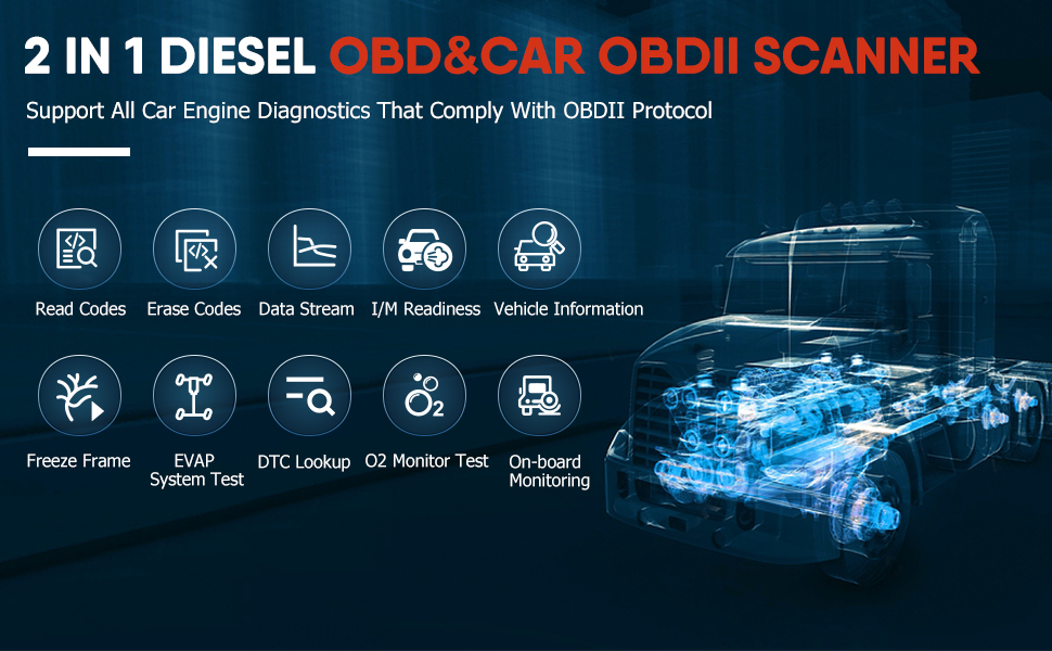 Этот диагностический сканер для грузовиков HD3200 поддерживает диагностику двигателя большинства автомобилей с протоколом OBDII (12 В) после 1996 года, который выполняет те же режимы OBD, что и обычный считыватель кодов OBDII.