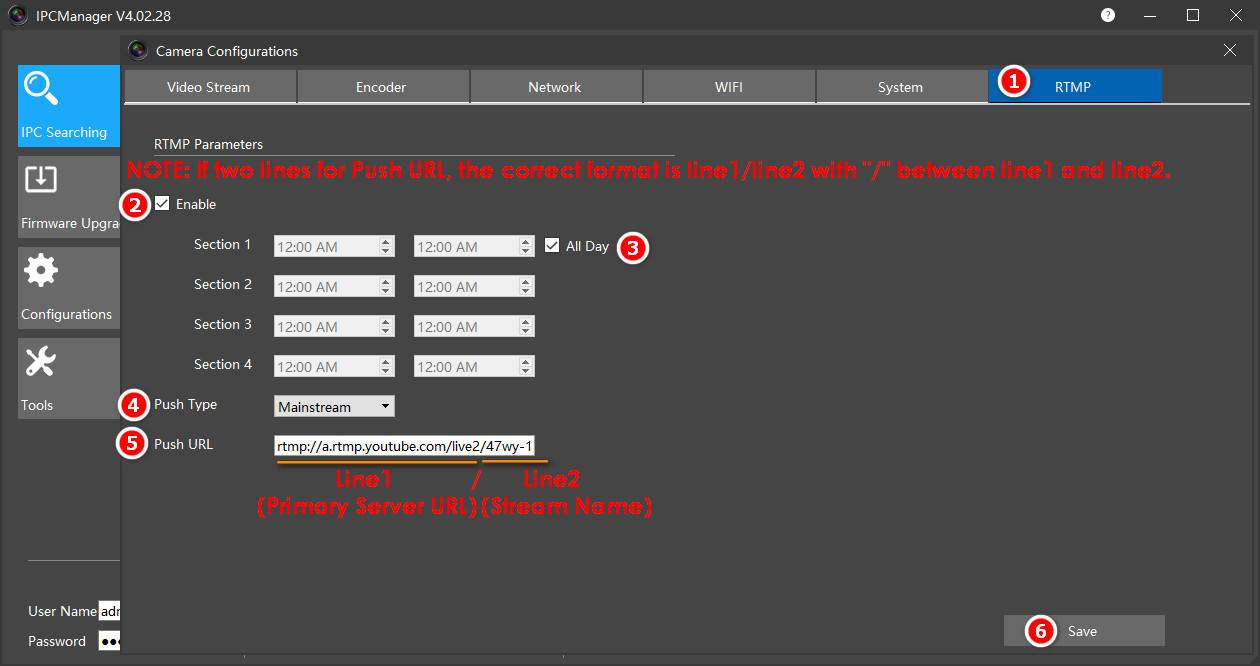 Найдите онлайн-энкодер от IPCManager и перейдите к конфигурации камеры->RTMP