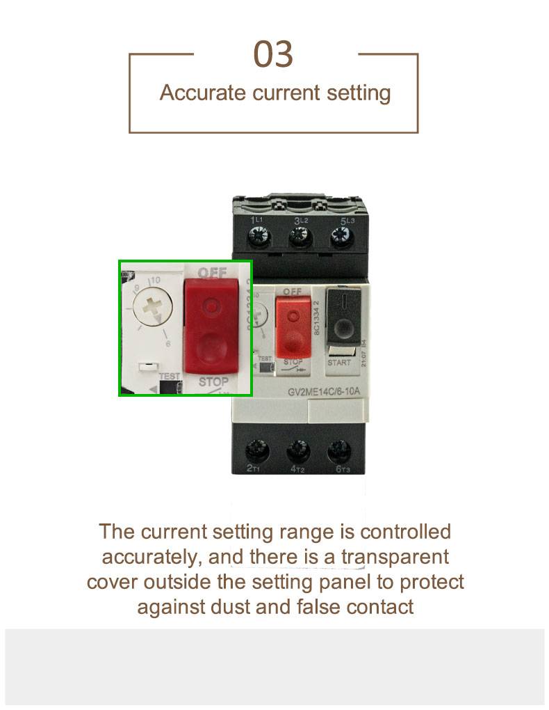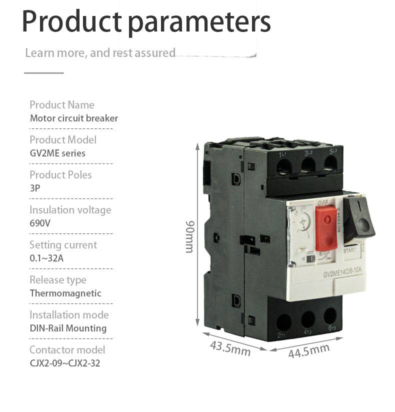 Автоматический выключатель двигателя переменного тока GV2ME применим к цепи с напряжением переменного тока до 690 В и током до 32А. Он может использоваться как защита от перегрузки, открытой фазы и короткого замыкания и нечасто запускаемый контроль трехфазного асинхронного двигателя клетки белки. Он может быть использован в качестве защиты распределительной линии, нечасто преобразования нагрузки и изолятор. Этот продукт соответствует GB / t14048 2, GB/T14048. 4 стандарта.