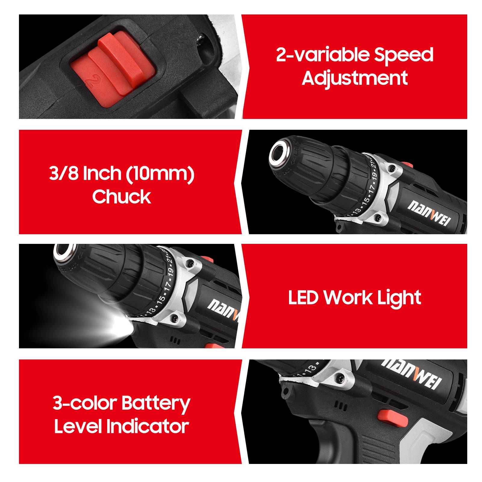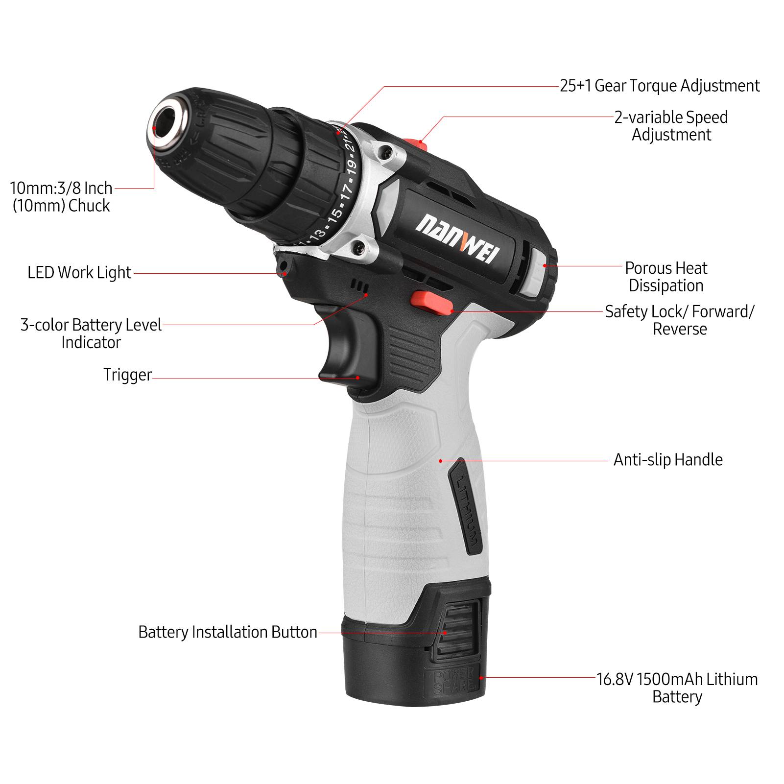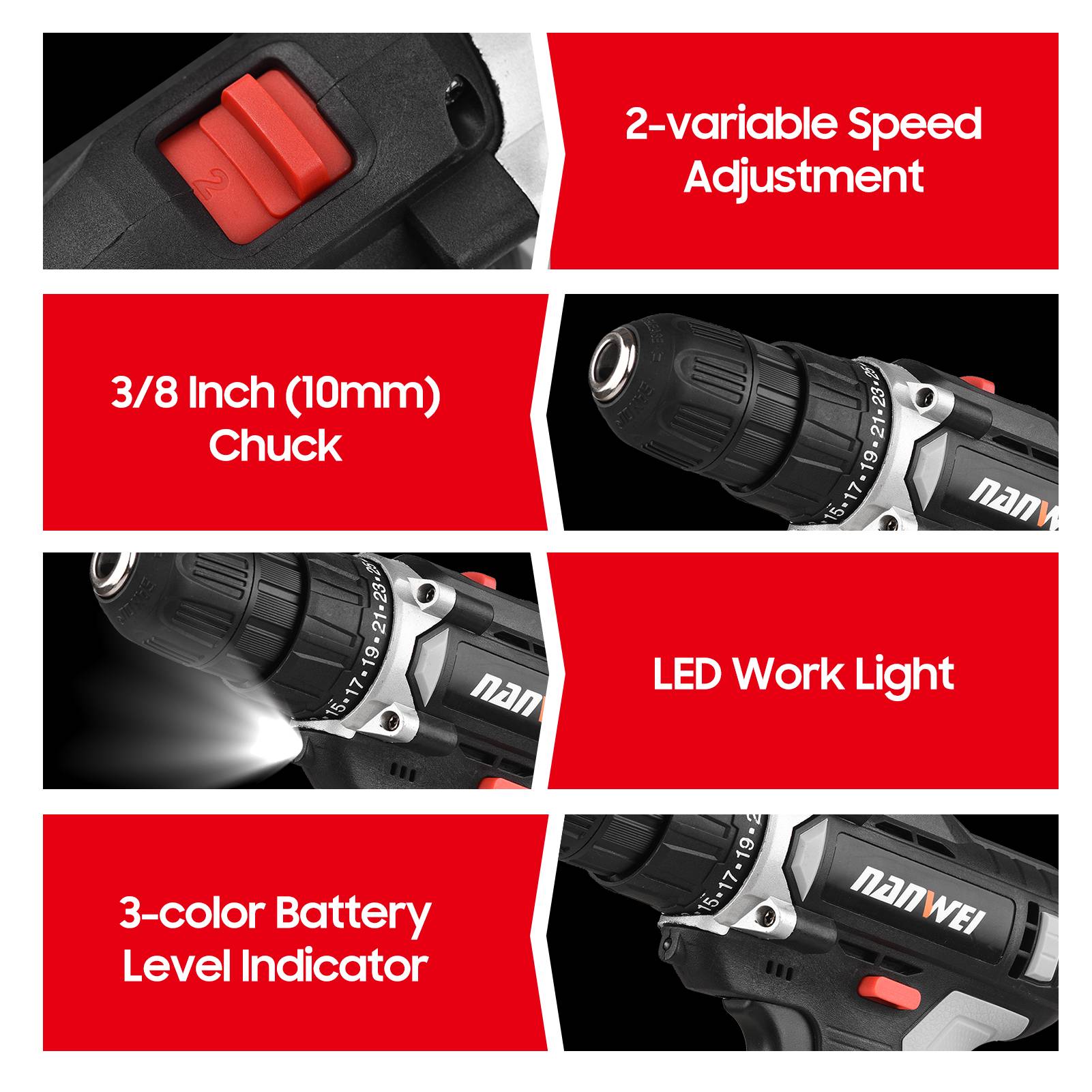 С одной стороны, легкая работа, с 3-цветный Светодиодный индикатор для обозначения уровня заряда батареи; Светодиодный рабочий светильник для обрабатки темное время суток; 2-регулировка скорости для удовлетворения различных потребностей; Пористая рассеивания тепла продлевает срок службы.