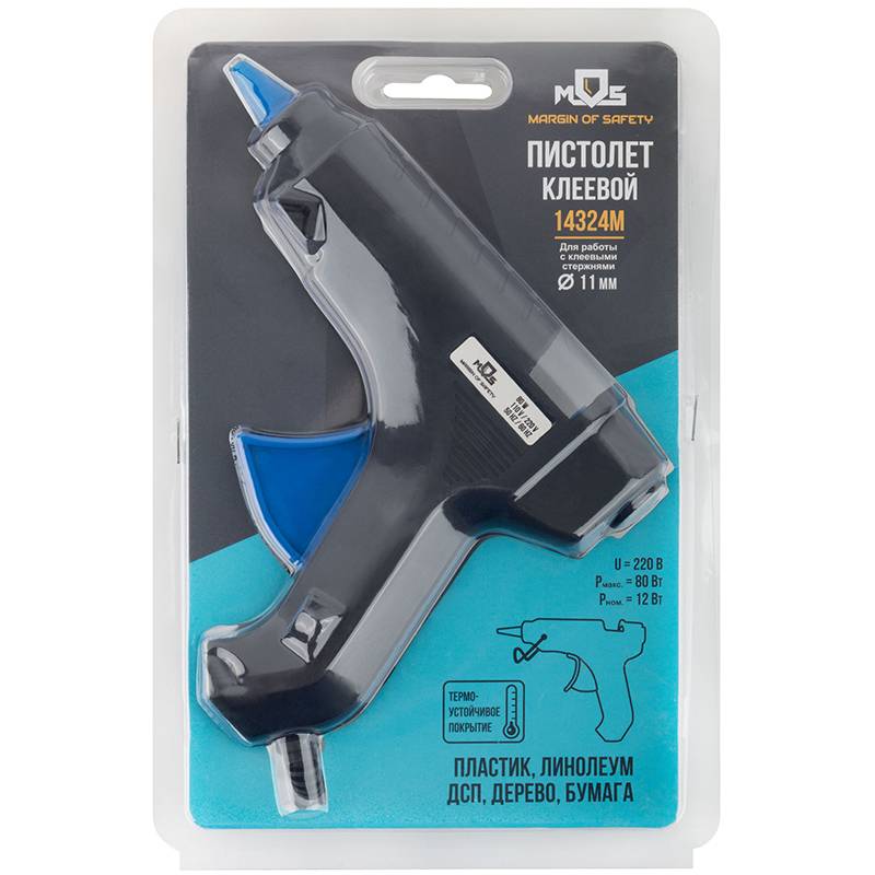 Пистолет клеевой д.11 мм , 12 Вт ( 80 Вт )220 В. Для склеивания дерева, бумаги, ДСП, линолеума и пластика. Используется с клеевым стержнем. Материал: пластиковый корпус, термостойкая резина, алюминиевый сплав. Упаковка: блистер.