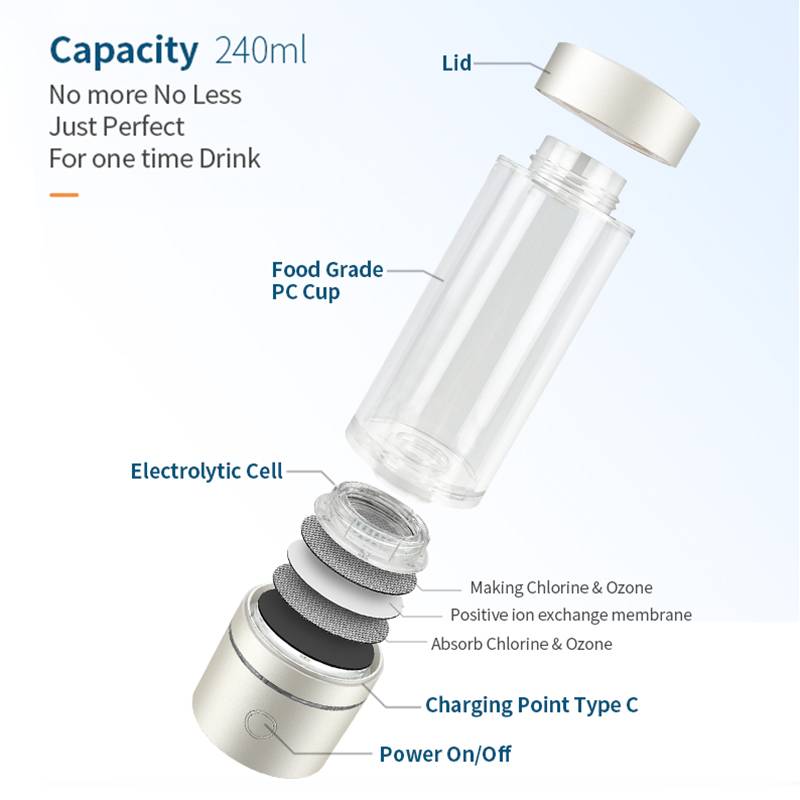 Портативный генератор водородной воды был разработан для производства высоких концентраций молекулярной водородной воды. 5 минут поколения H2 может наполнять любую питьевую воду нанопузырями молекулярного водорода с концентрацией до 3000 ppb (3,0 ppm). С дополнительными 1-2 циклами Уровень водорода может достигать до 5000 ppb (5,0 ppm).
