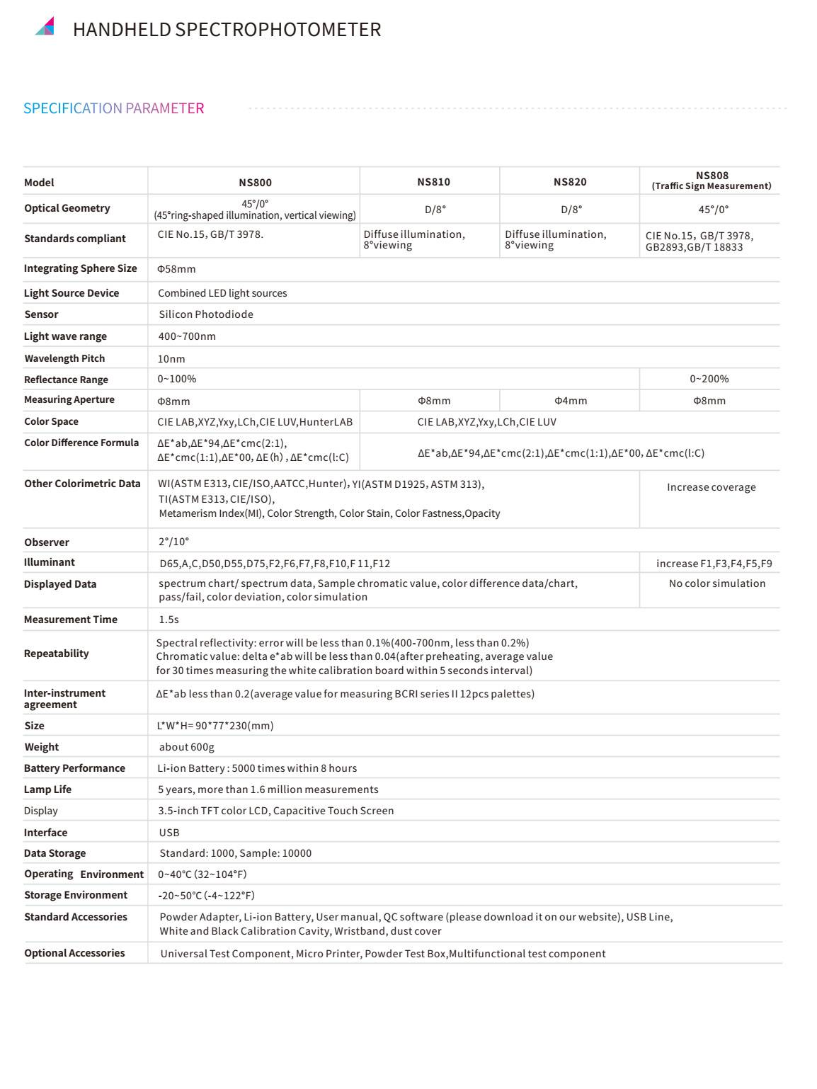 NS820 спектрофотометр настраивается с 2 видов наблюдатель углов, 2 ° и 10 °, несколько светильник типа источника, несколько цветового пространства системы, несколько цветности показатели в соответствии с различными стандартами, все из которых делают NS820 может превосходно выполнять все виды требований для цветовых измерений в различных отраслях промышленности.