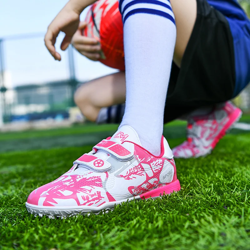 Модные розовые детские дешевые футбольные Туфли на липучке для мальчиков и девочек, тренировочные футбольные бутсы, детские футбольные бутсы, спортивные кроссовки
