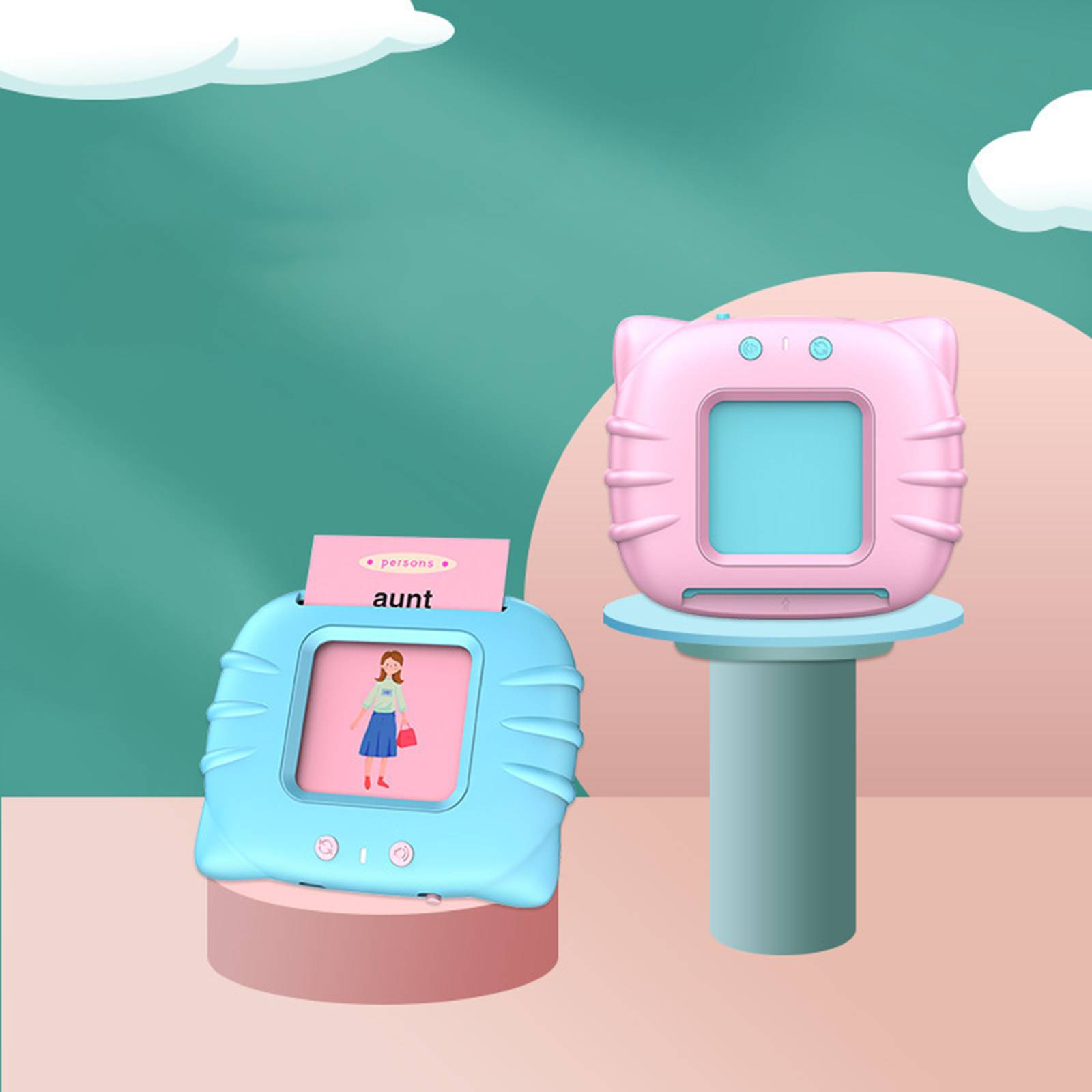 Обучающая машина: карточки включают животных, предметы, транспортные средства, продукты питания, фрукты, овощи, одежду, природу, цвет, характер, занятие и формы. Четкое определение, повторяющееся чтение и визирование слов значительно имитируют язык и воображение детей.