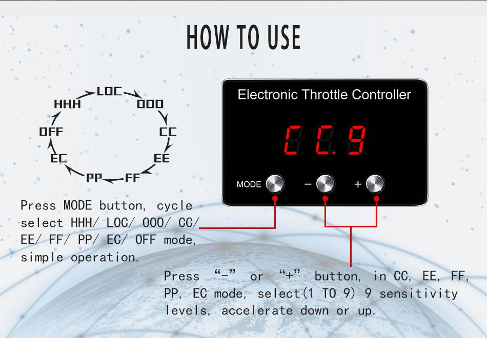Экономичный режим предлагает (от 1 до 9) 9 уровней чувствительности, предназначен для экономии за счет уменьшения времени отклика ускорителя. Также удобно, когда вы находитесь на тропах и ищете немного больше управления дроссельной заслонкой при ползании.