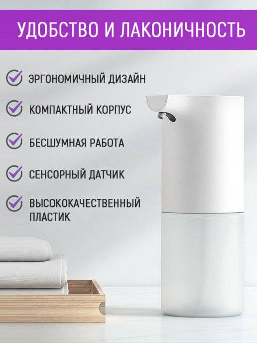 Дозатор БЕЗ мыла. Необходимо отдельно приобретать сменные блоки мыла. Лауреат премии Good Design Award 2018 за превосходный дизайн Бесконтактный дозатор для жидкого мыла не только помогает сэкономить время и воду, но и обеспечивает максимальную гигиеничность. Его компактный корпус, выполненный в минималистичном дизайне, с легкостью впишется в любую ванную комнату и оставит самые приятные ощущения от использования. Автоматическое бесконтактное реагирование Защита здоровья всех членов семьи начинается с правильного мытья рук. Достаточно протянуть руку, и дозатор выдаст пышную пену, которая эффективно очистит руки и обеспечит необходимую защиту от бактерий. Мягкая пена поможет приучить даже маленьких детей к правильной гигиене. Помогает выработать здоровую привычку, как рекомендует Всемирная организация здравоохранения.