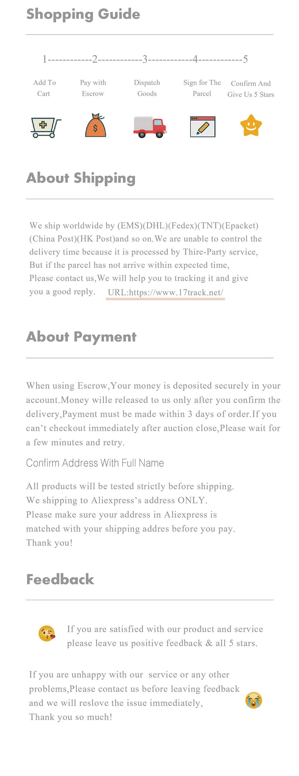 1. Пожалуйста, оставьте 5 звезд отзывы, если вы удовлетворены нашей продукцией и обслуживанием, Мы будем признательны (товар, как описано 5 звезд, связь 5 звезд, время доставки 5 звезд).