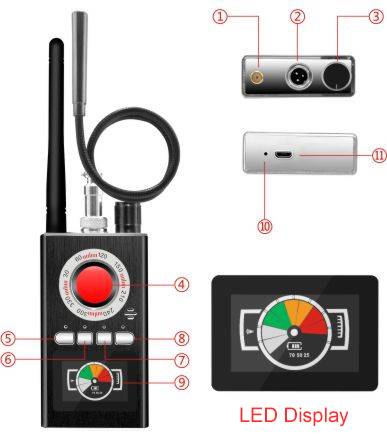 ① На левой стороне находится Антенный интерфейс, пожалуйста, установите антенну при использовании оборудования ②on middle-это Магнитный зондовый интерфейс, в основном используется для магнитного притяжения продуктов с сильным сокрытием, таких как позиционер, подследник, И т. д. ③ справа находится выключатель питания и беспроводного обнаружения (поверните вправо, Можно регулировать чувствительность) ④ это окно/азимут диам., это окно использует специальный фильтр объектива, и функция этого фильтра объектива сканирует скрытые Проводные или беспроводные камеры с светодиодный инфракрасной лазерной технологией. ⑤ ключ переключения режимов вибрации и кольца. ⑥- высокоинтенсивный магнитный переключатель обнаружения, когда светодиодный режим ожидания, Красный светильник на подушке-это светильник ing. ⑦Это переключатель обнаружения камеры, три шестерни регулируются. Intelligent-это интеллектуальная Клавиша режима обнаружения. Светодиодный экран ⑨( индикатор интенсивности сигнала с кодовым счетчиком и индикация электричества) светильник-светильник индикатора зарядки (при полной зарядке светильник выключится)