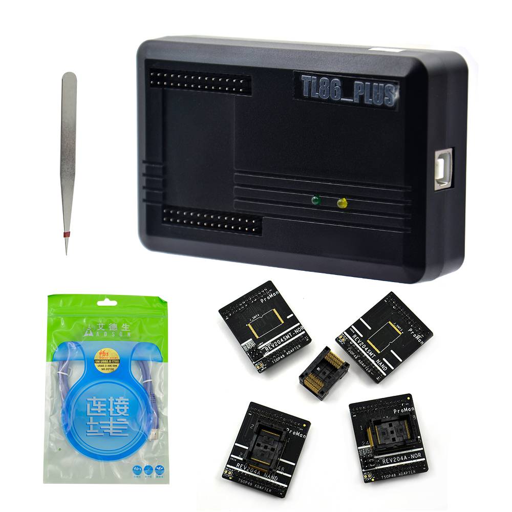 one pcs Proman Programmerone pcs NAND ZIF adapterone pcs NAND SMD adapterone pcs NOR ZIF adapterone pcs NOR SMD adapterone pcs USB cableone tweezers