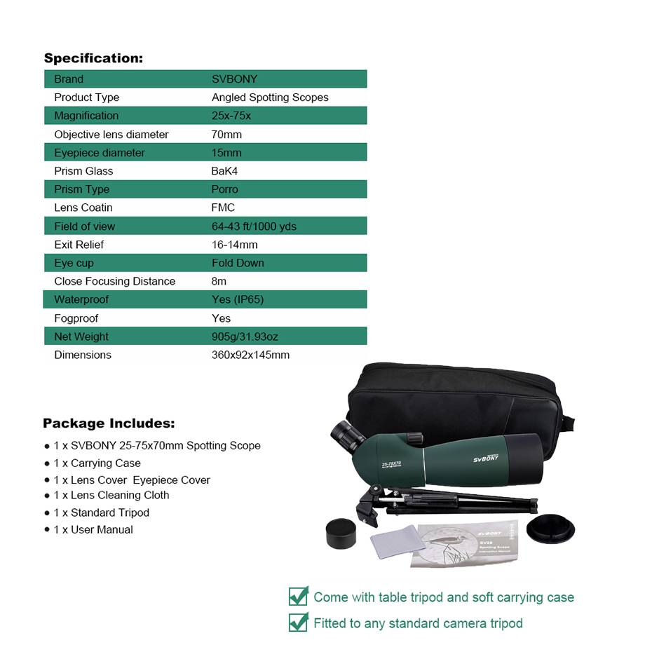 25-75x зум: Зрительная труба SV28 легко фокусируется и изменяет увеличение, легко настраивается при взгляде на птиц и пейзажи. Отличный зрительный прицел для начинающих и начинающих.