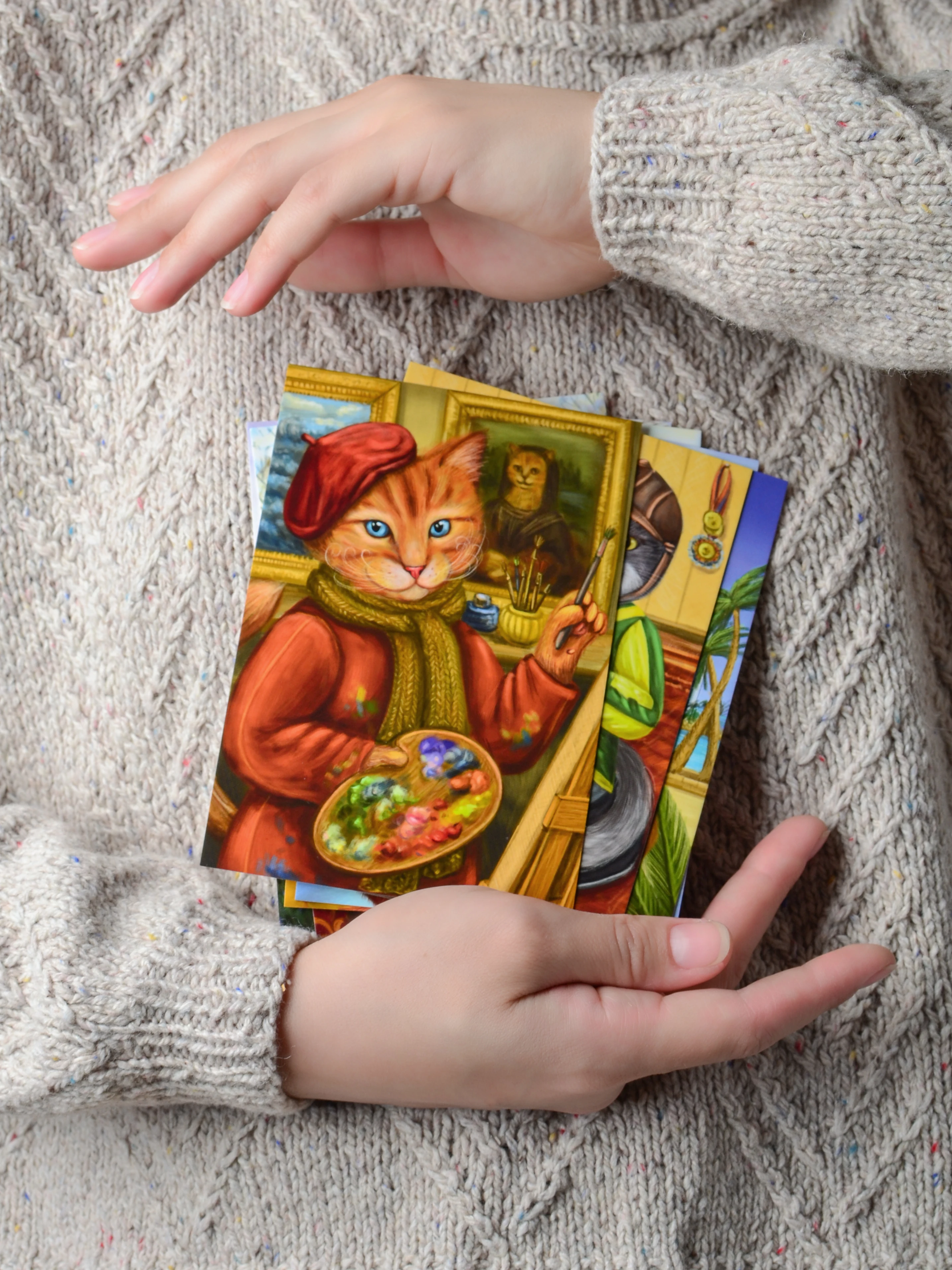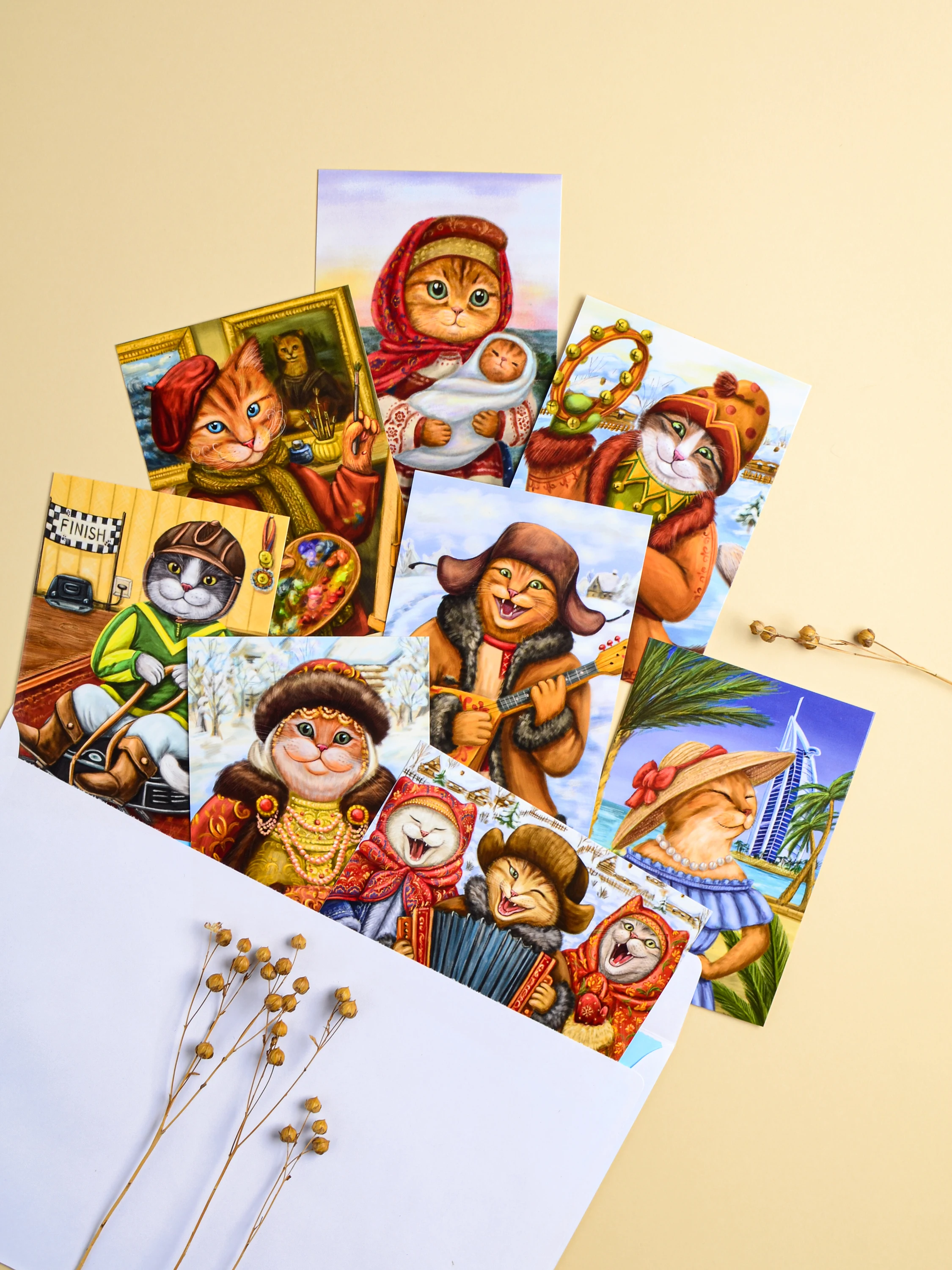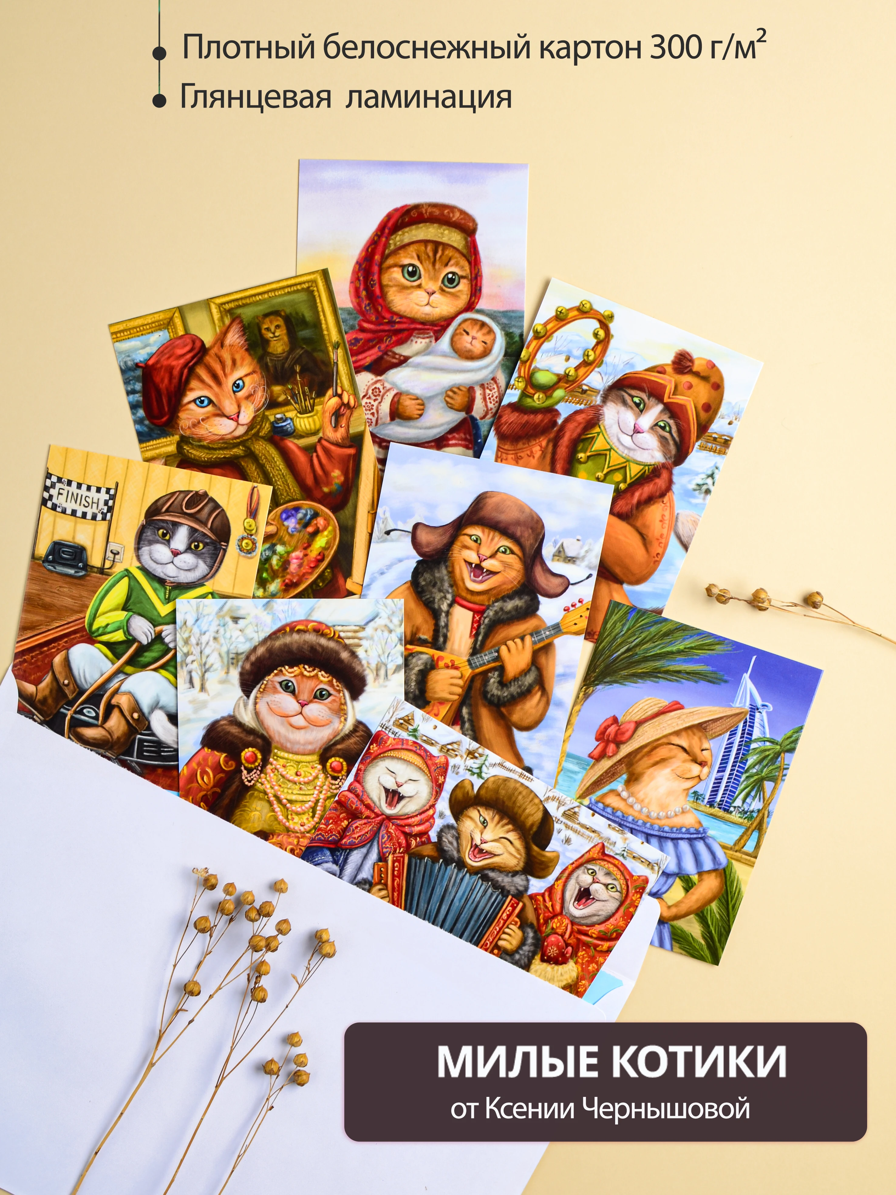Почтовые открытки с милыми котиками от Ксении Чернышовой подойдут для посткроссинга, в качестве подарка детям, дочери, сыну, другу, парню, подруге, маме, бабушке, коллеге, мужу, папе или дедушке. Открытки можно использовать в качестве декора для дома вместо постеров, для букета, для украшения мудбордов, для творчества, рисования, фотосессии, в качестве закладки для книг или как бирки на подарок. Почтовые открытки могут быть идеальным подарком на Новый Год, День Рождения, 8 марта, 23 февраля, день влюбленных или именины.