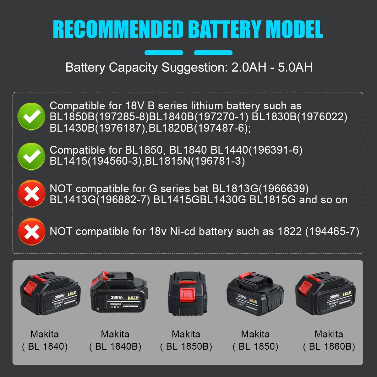 √ Совместим с литиевой батареей серии 18 в B, такими как BL1850B(197285-8),BL1840B(197270-1),BL1830B(197602-2),BL1430B(197618-7),BL1820B(197487-6);