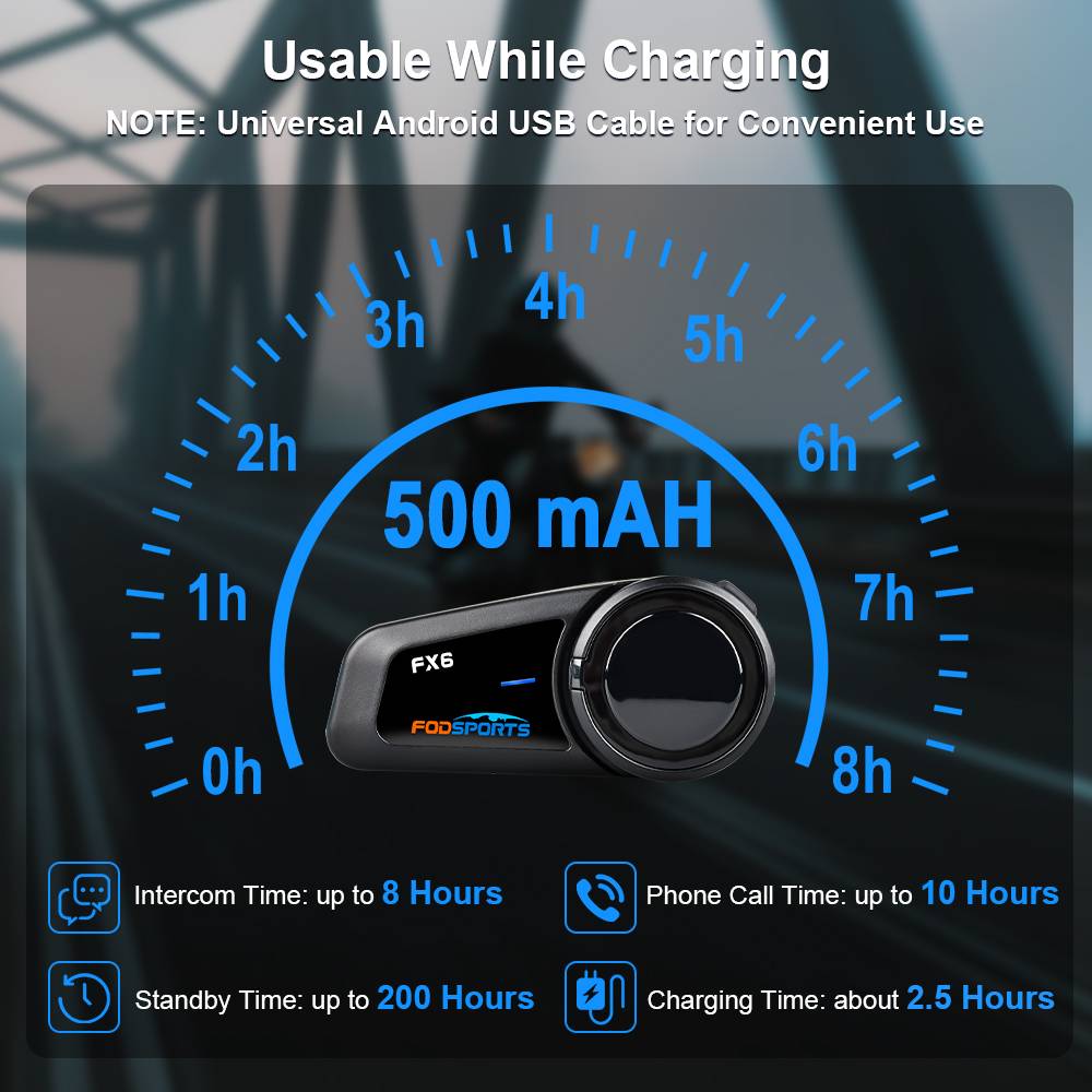 Макс. диаметр 1000 м FX6 оснащен чипом Bluetooth CSR, он обладает высокой совместимостью и стабильностью. Если нет препятствий, таких как здания в прямой линии, мотоциклетный шлем Интерком максимальное расстояние связи группы составляет около 1000 метров, максимальное эффективное расстояние связи между двумя мотоциклами составляет около 1000 метров, оба могут говорить с четким качеством звука.