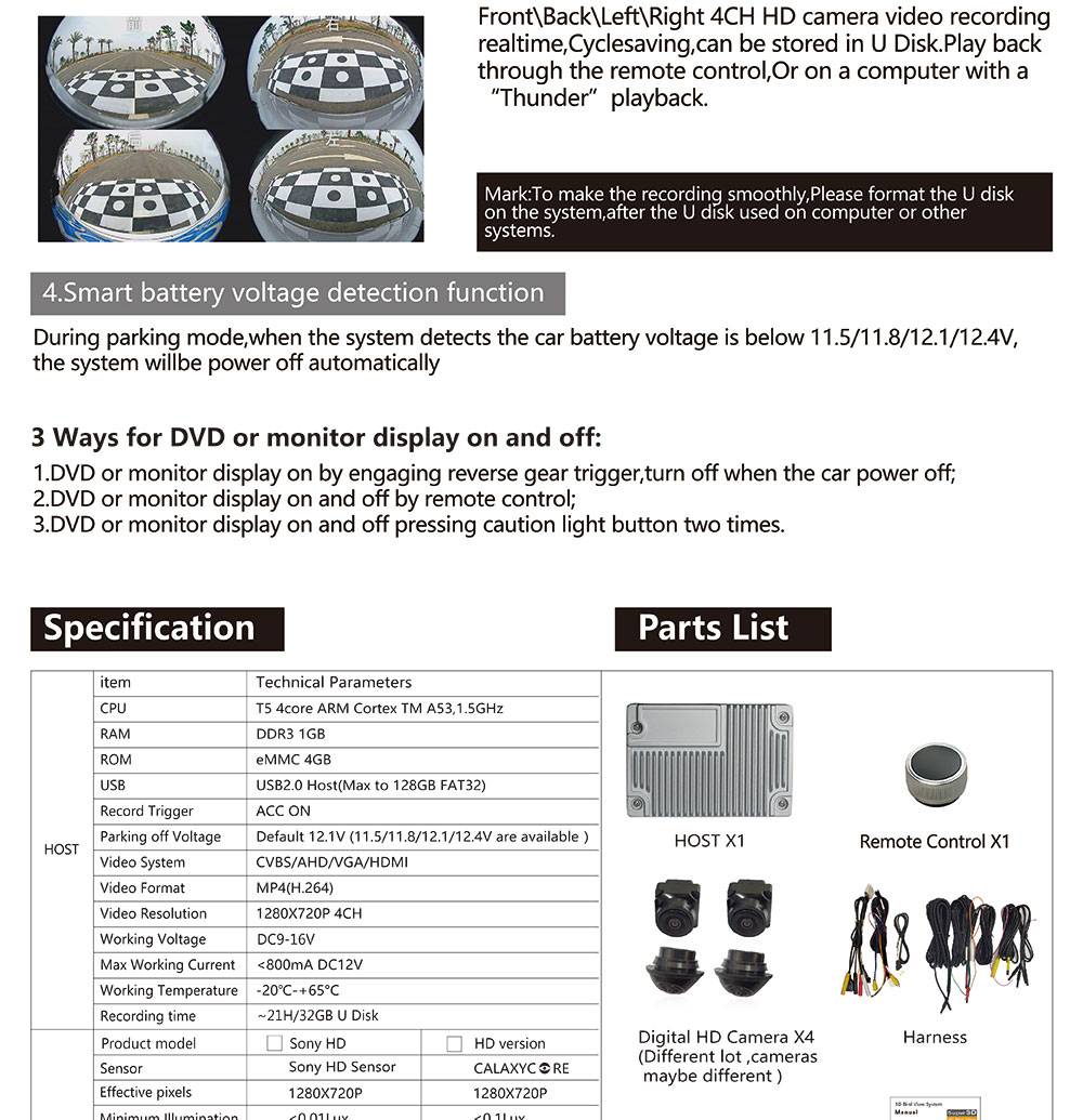 Когда автомобиль задним ходом, поверните влево или вправо, 360 система триггера сигналом лампы, автомобильный экран автоматически переключается на задний, левый, правый вид, затем показывает передний вид после запуска. С функцией мониторинга парковки и видеорегистратором