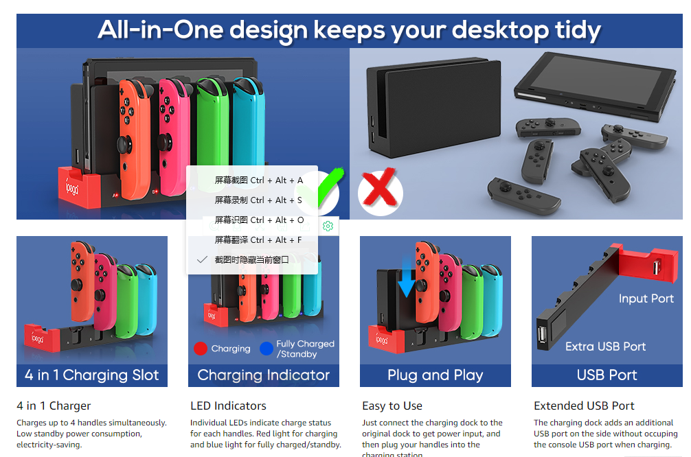 2. Этот продукт имеет 4 слота, используемые для зарядки, поддержка зарядки 1-4 шт геймпадов Joy-con одновременно;
