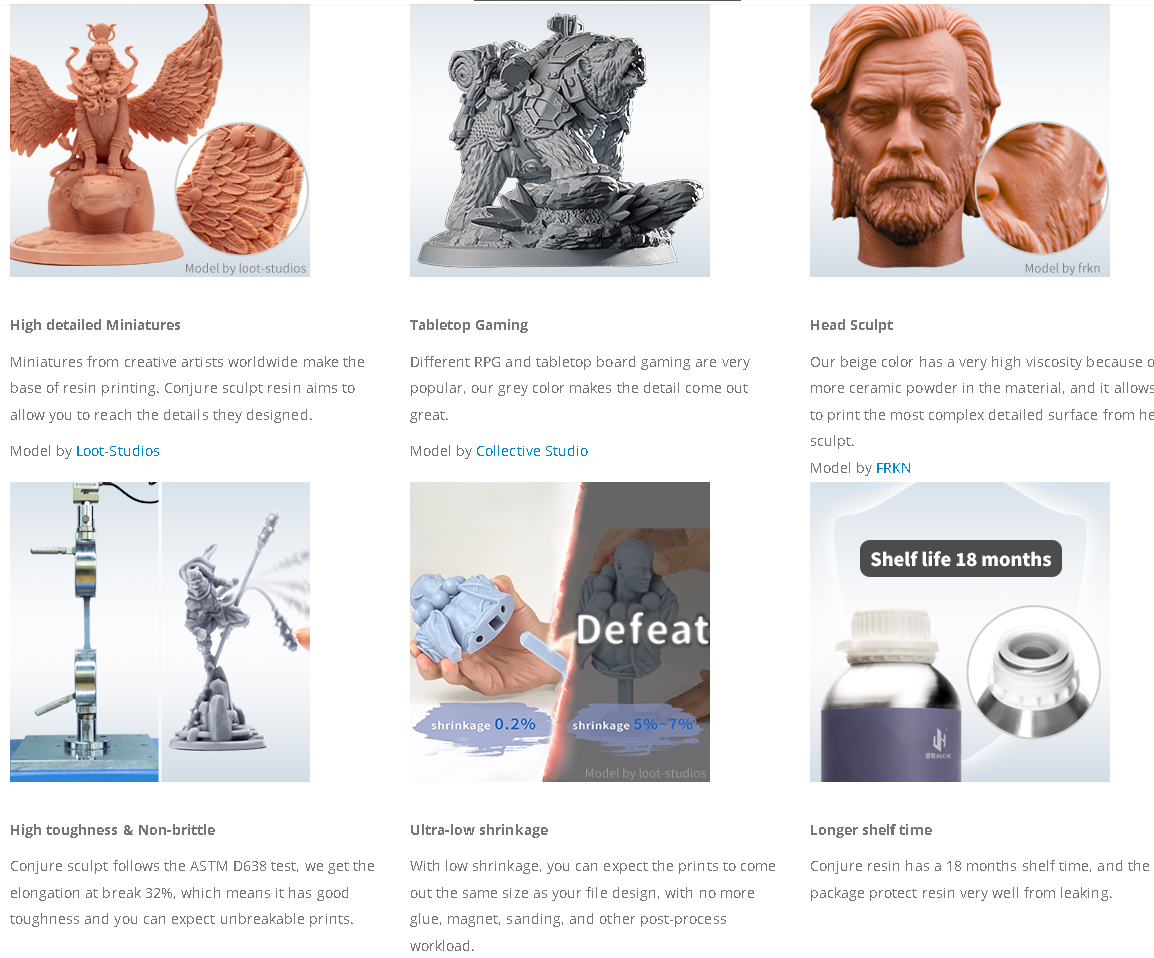 Для миниатюрных или фигурок, детали и небьющиеся ключевые требования, вы можете использовать Conjure Sculpt смолы, или смешать Siraya tenacious с нормальной смолы.