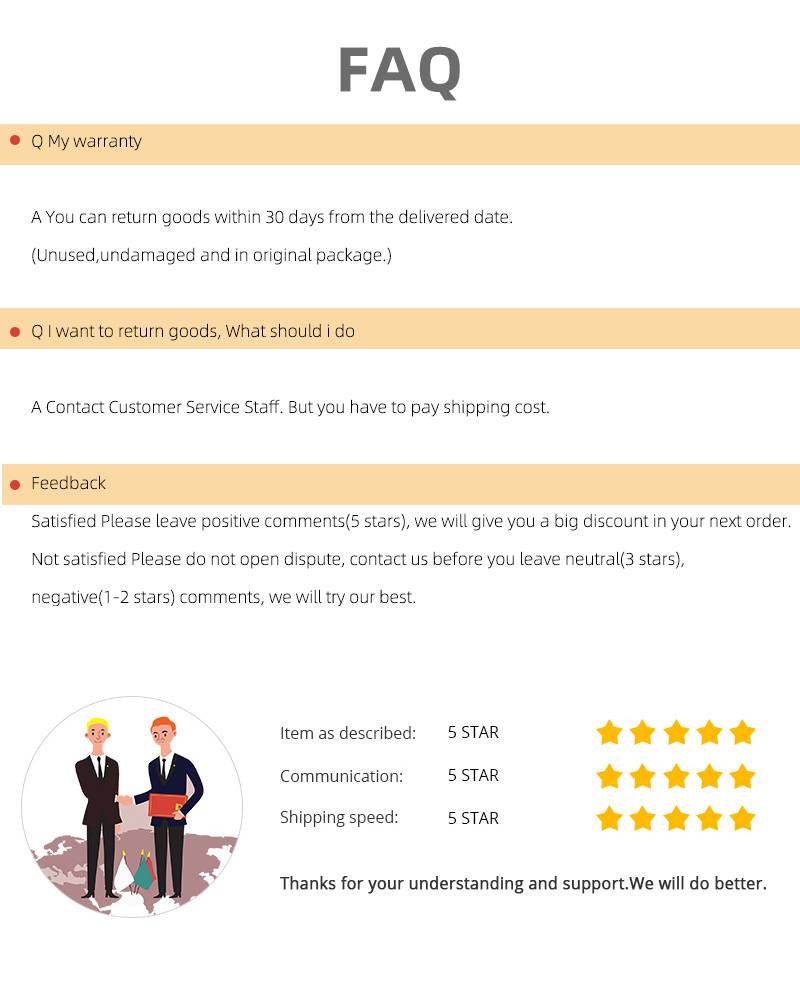 2. Пожалуйста, свяжитесь с нами, прежде чем оставлять нейтральные (3 звезды) или отрицательные (1-2 звезды) отзывы. Мы постараемся сделать все возможное, чтобы решить проблему и оставить вам счастливую покупку здесь. Спасибо!