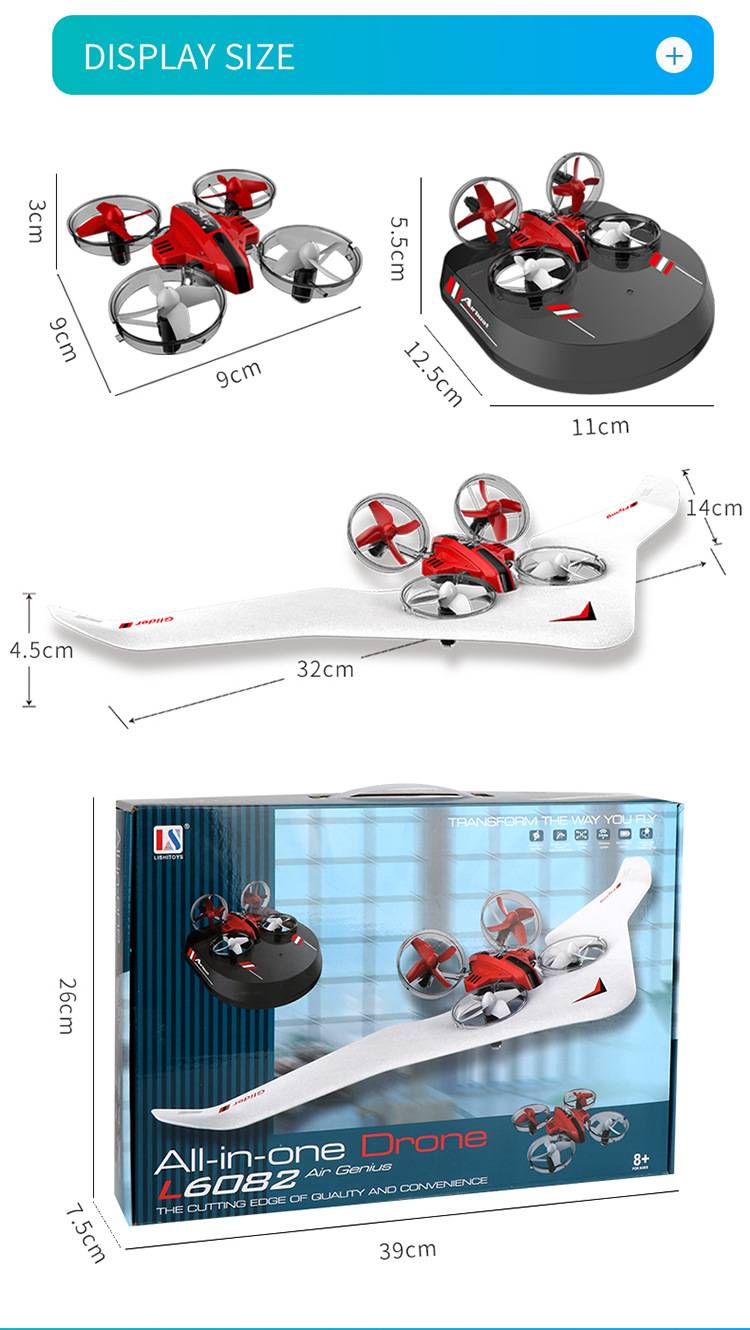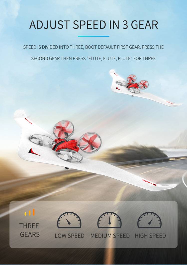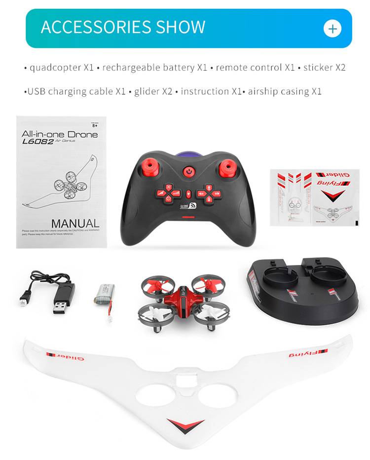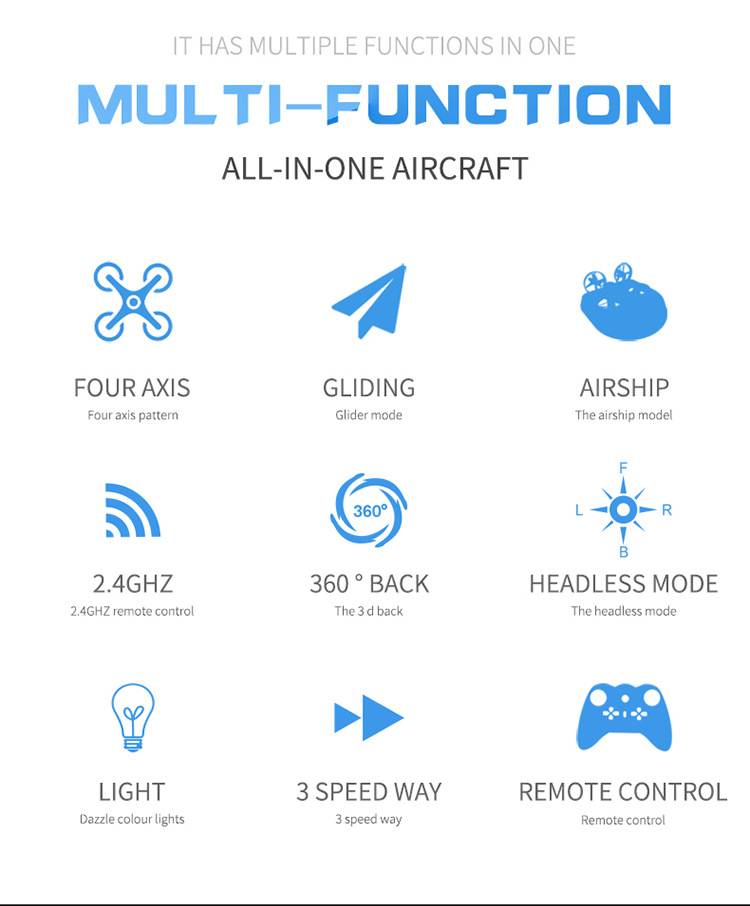 Описание: modo todo en uno: modo de vuelo de cuatro ejes, modo de deslizamiento, modo aeroplano; Rollo 3D, modo sin cabeza, interptor de luz, ajuste de velocidad de tres velocidades; hacia adelante y hacia atras, lado izquierdo y derecho volar; Управление inalambrico de 2,4 г