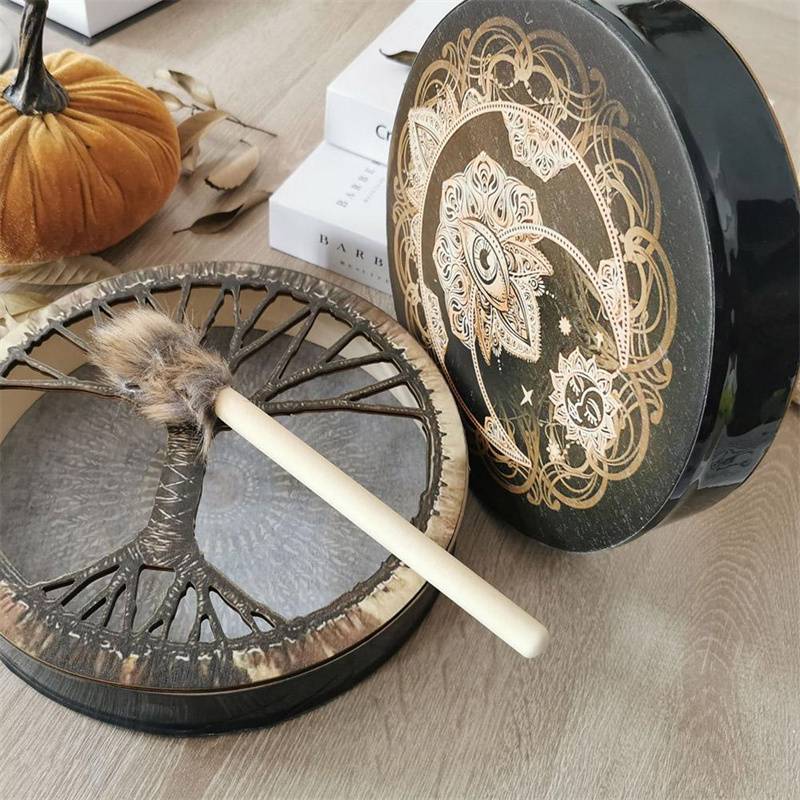 1. Шаманские барабанные украшения изготовлены вручную из высококачественной древесины + кожи, что гарантирует длительный срок службы этого барабана.