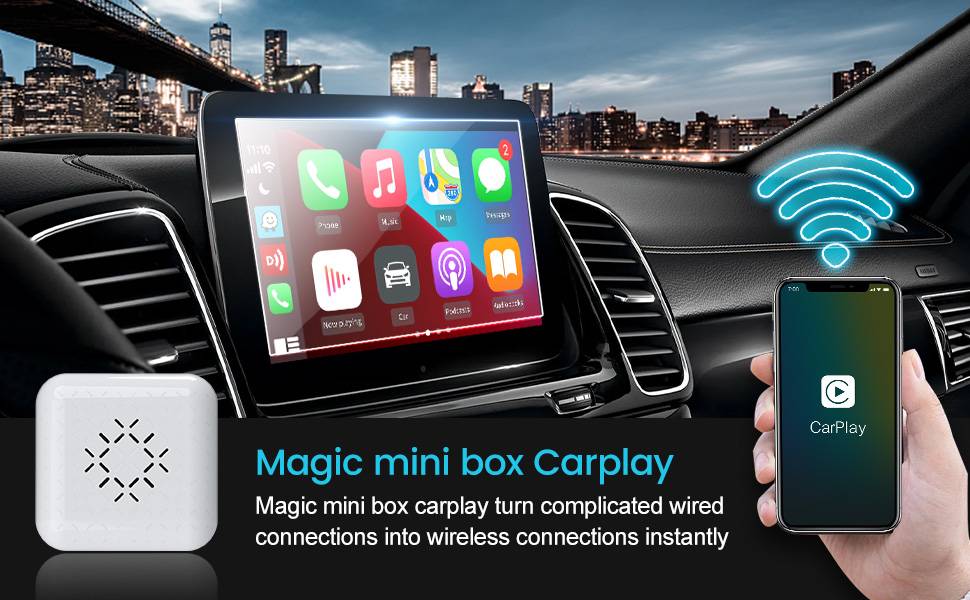 После установки адаптера ваш телефон будет автоматически подключаться к вашей развлекательной системе, как только автомобиль запустится. Преобразуйте оригинальную проводную CarPlay в беспроводную CarPlay. Поддерживает все оригинальные функции CarPlay. Такие как Голосовое управление, Siri, gps-навигационное приложение (навигация в реальном времени), онлайн музыкальное приложение, мобильный телефон, приложение для музыки, информация, оригинальная кнопка управления автомобилем.
