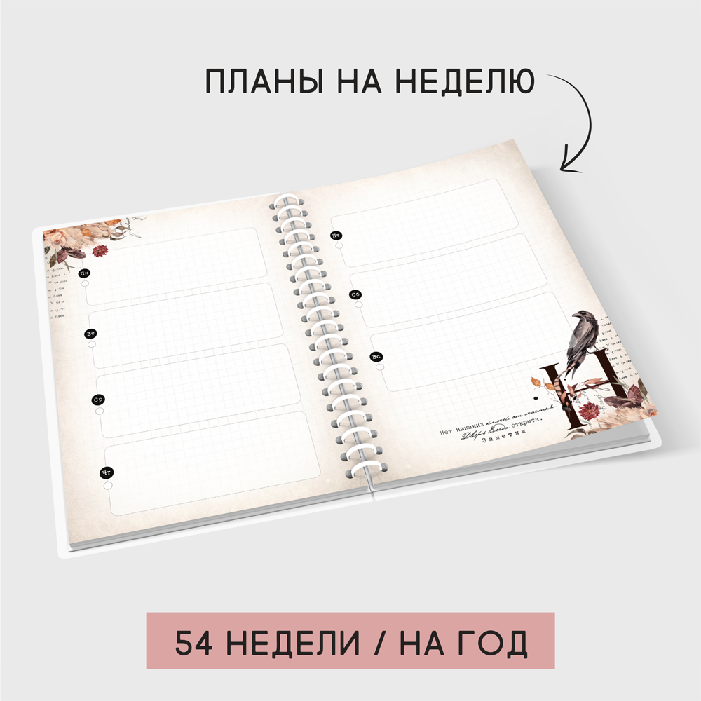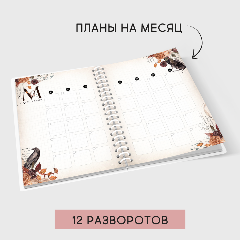 Структура планера: обложка, календари 2022-2024, планы на год, фокус месяца, привычки месяца, планы на месяц, планы на неделю, дополнительные разделы, блок с листами для заметок