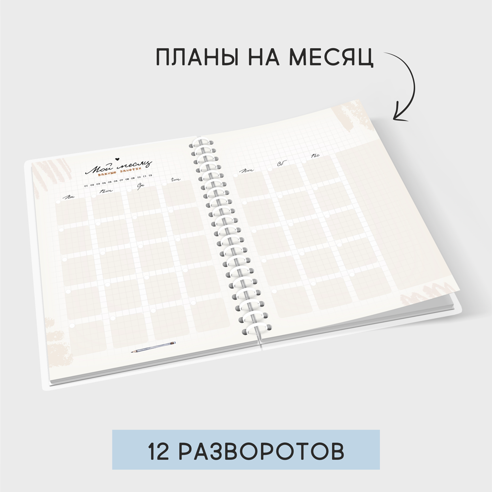 Структура планера: обложка, календари 2022-2024, планы на год, фокус месяца, привычки месяца, планы на месяц, планы на неделю, дополнительные разделы, блок с листами для заметок