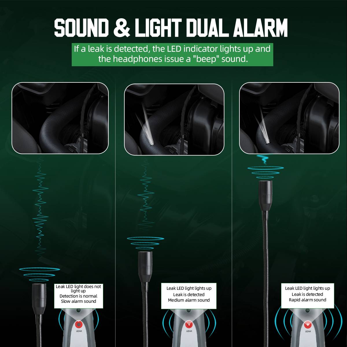 Индикация тревоги: светодиодный индикатор «Утечки» и «тикающий тон» увеличивает частоту.